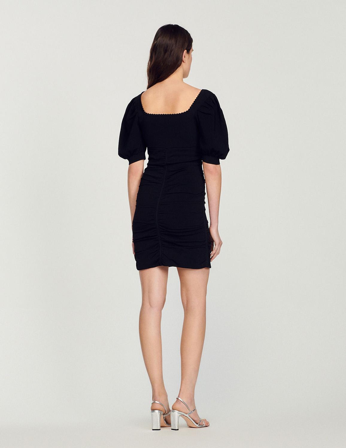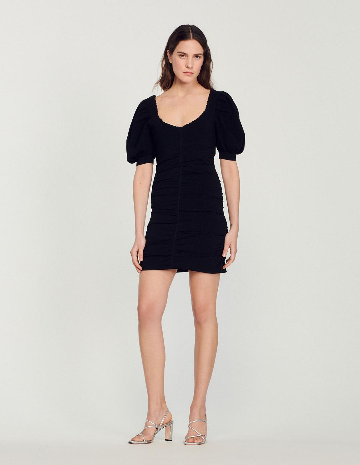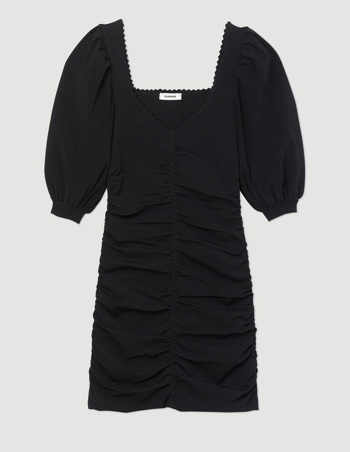 • Short dress in a gathered compact knit featuring 3/4-length full sleeves and a V-shaped neckline with fancy trim.