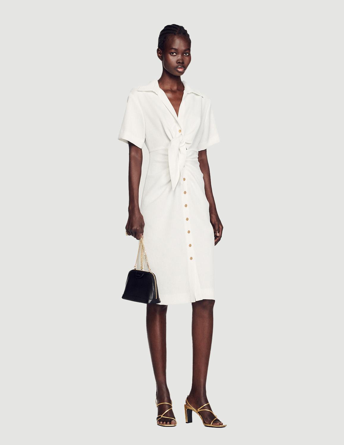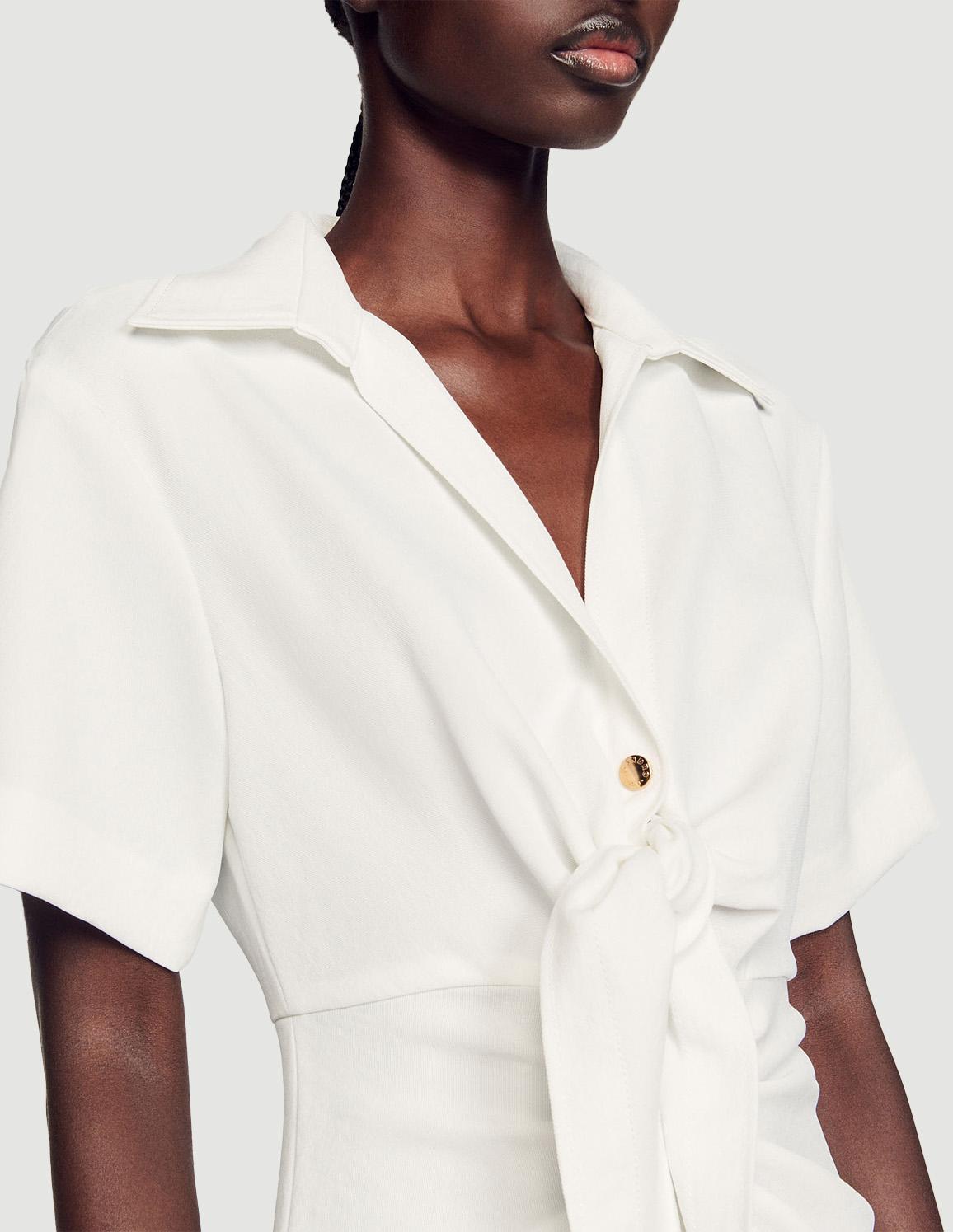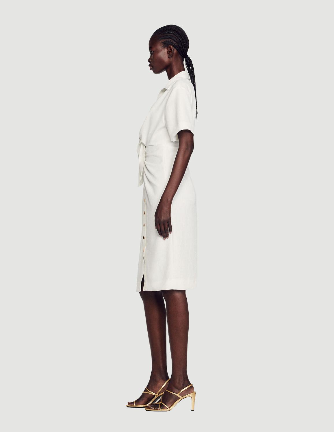 • Buttoned midi dress with a gathered front, a shirt collar and V-shaped neckline, short sleeves, and a tie fastening.