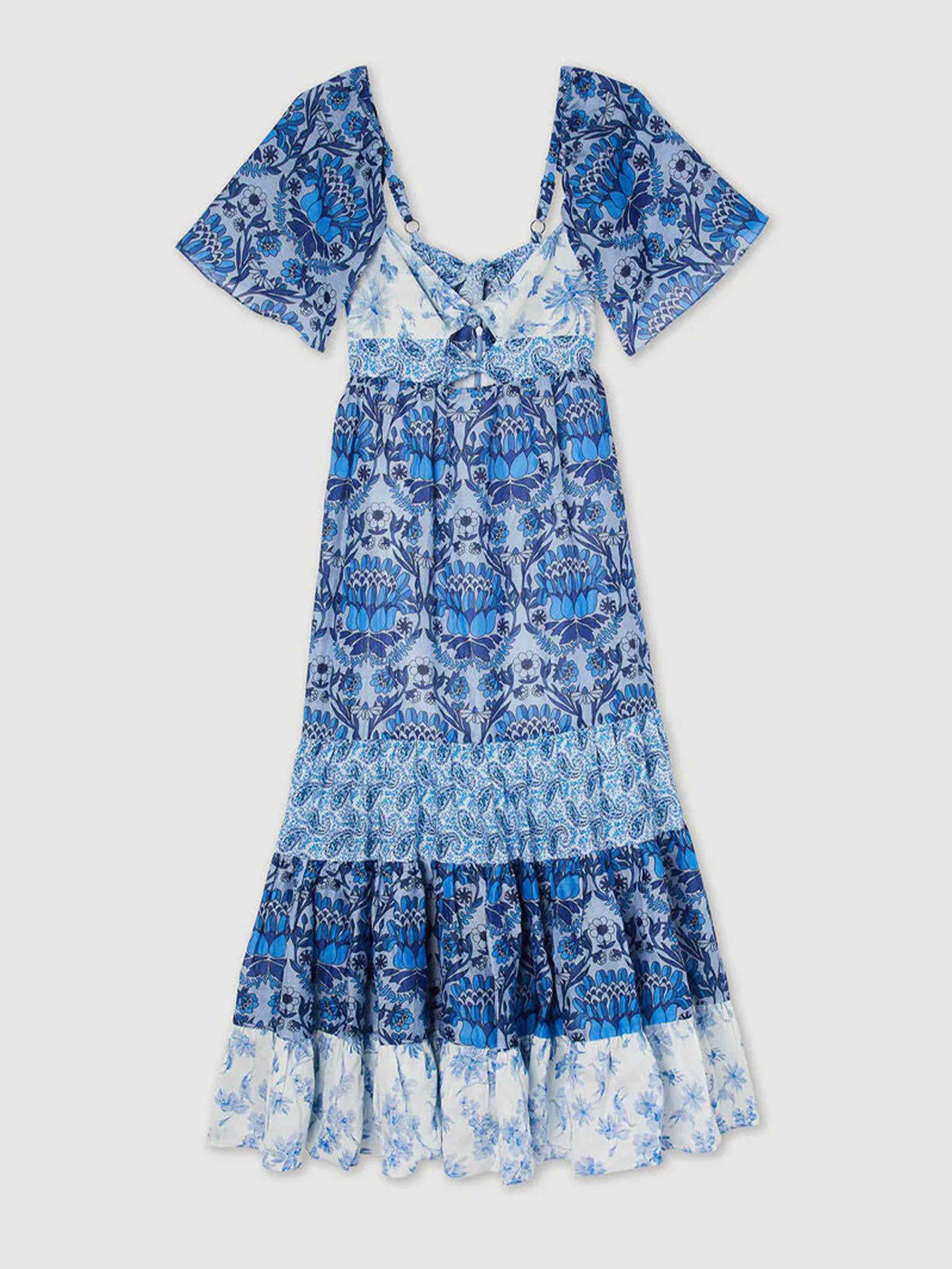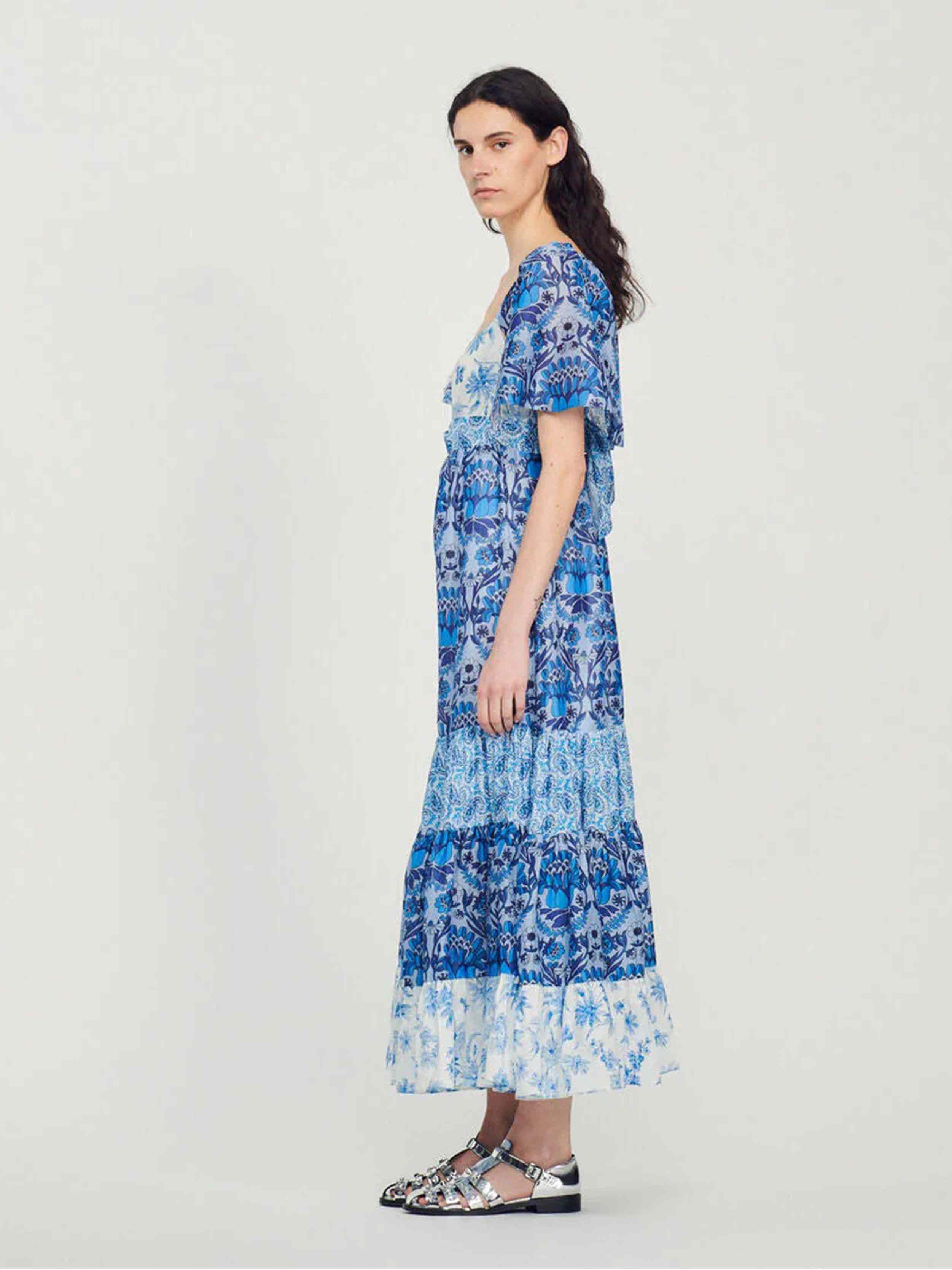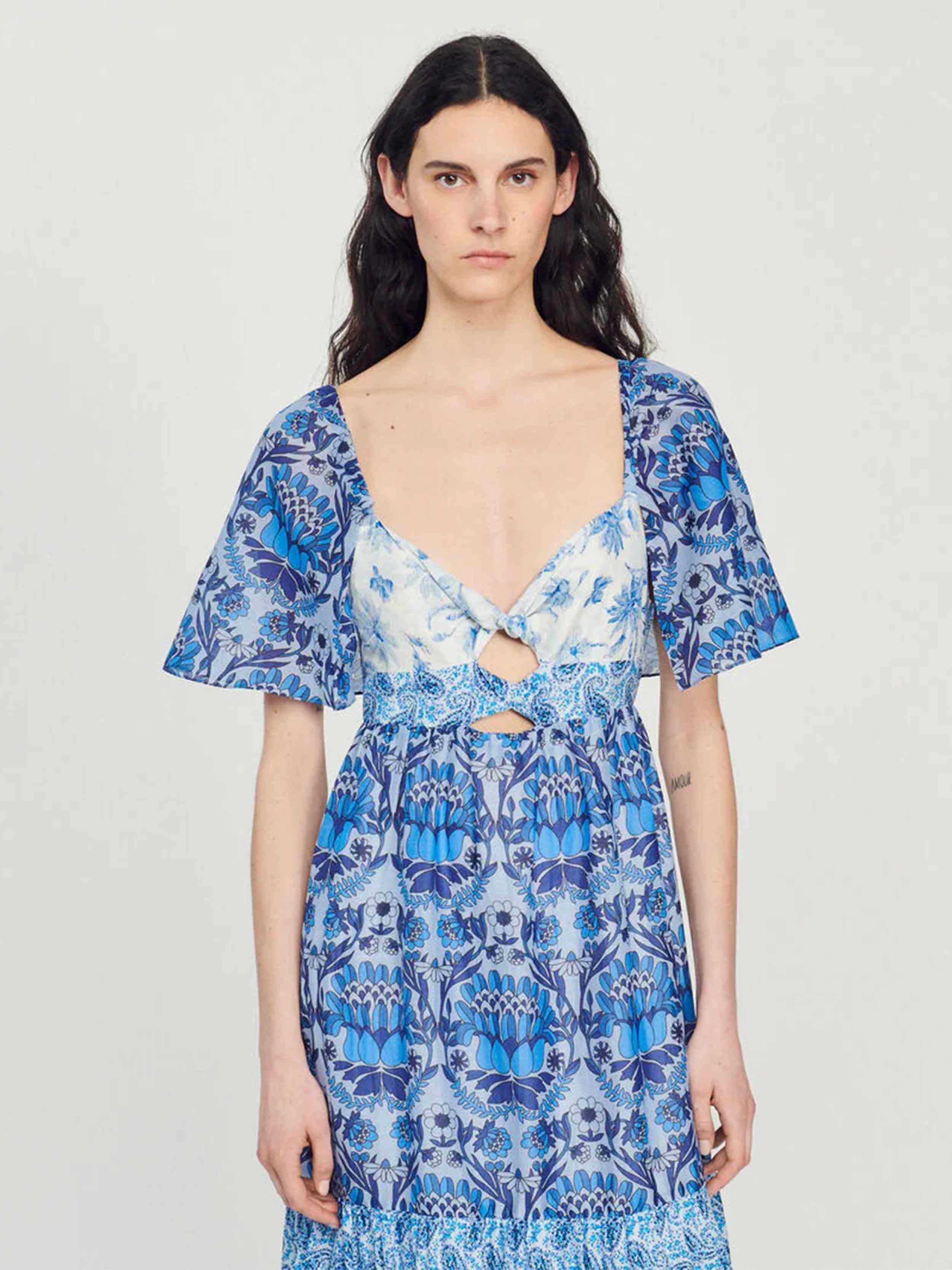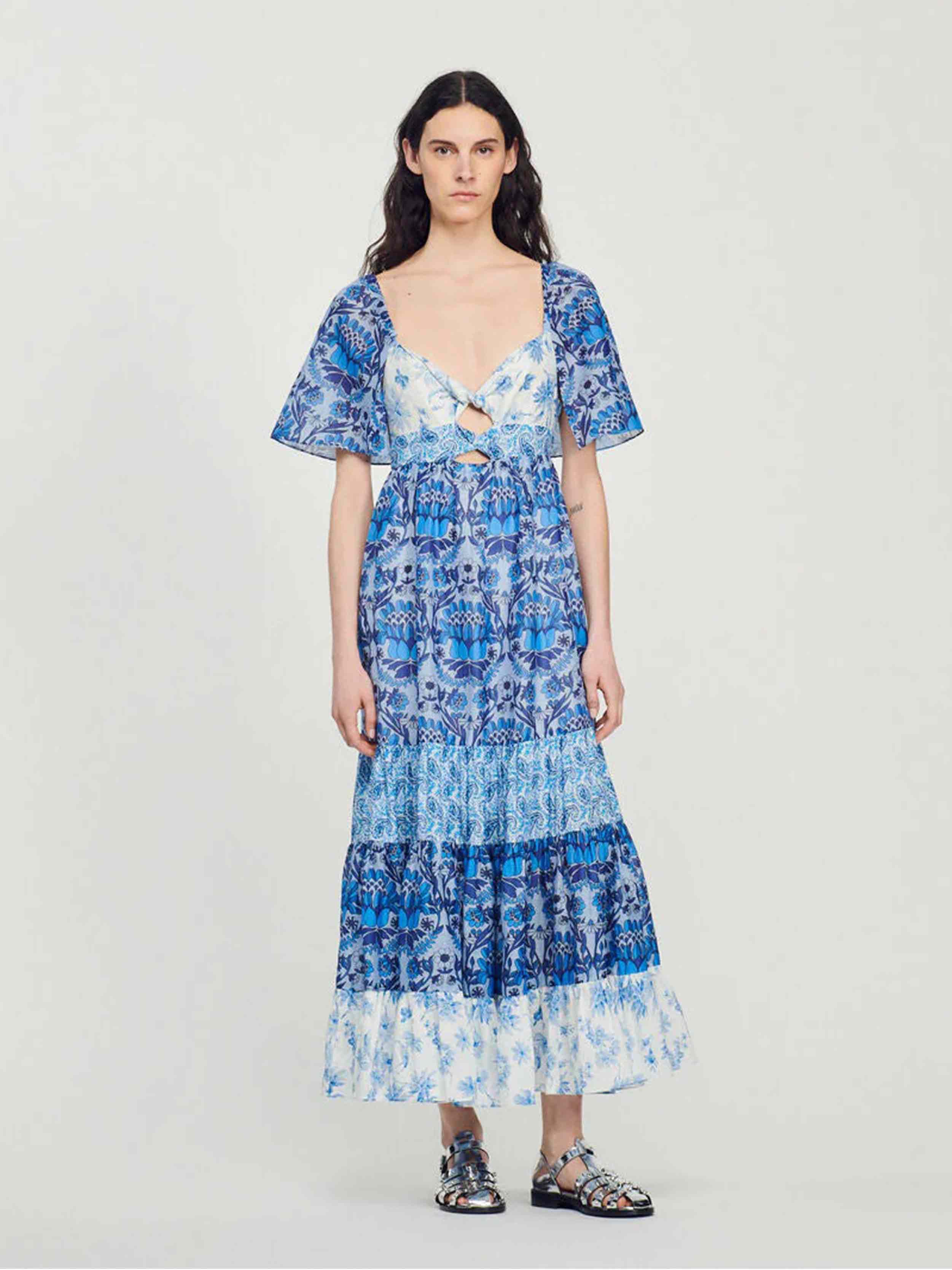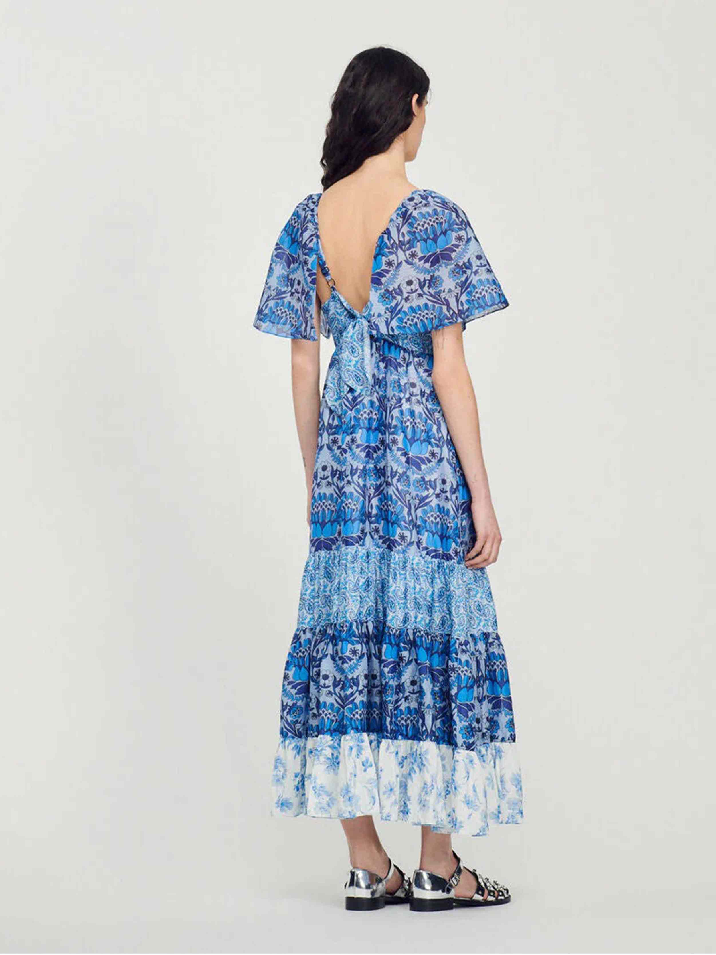• Long flowing dress with a scarf print, a V-shaped neckline with twisted details, short ruffle sleeves, a flared skirt hem, and a tie fastening at the back.