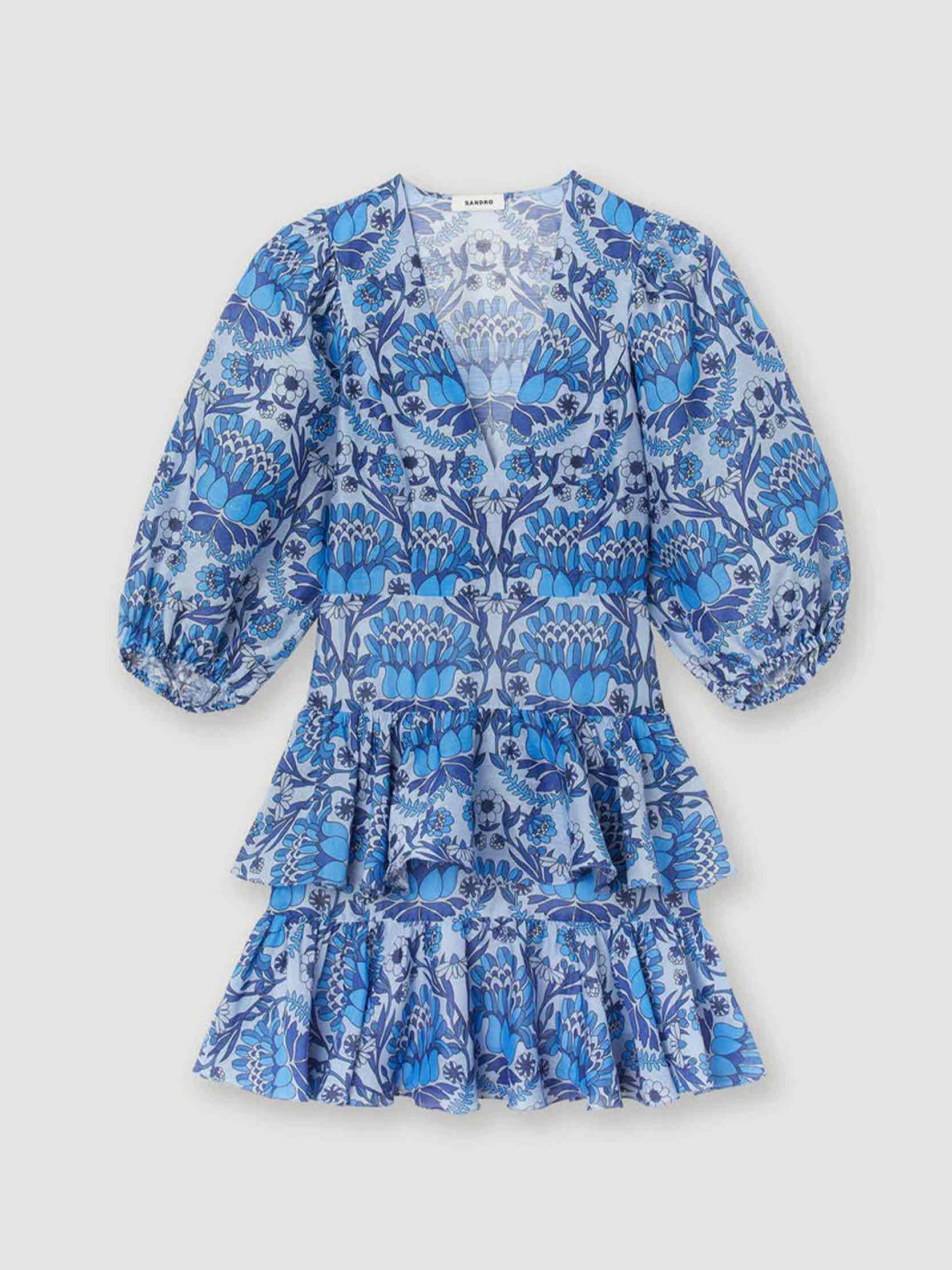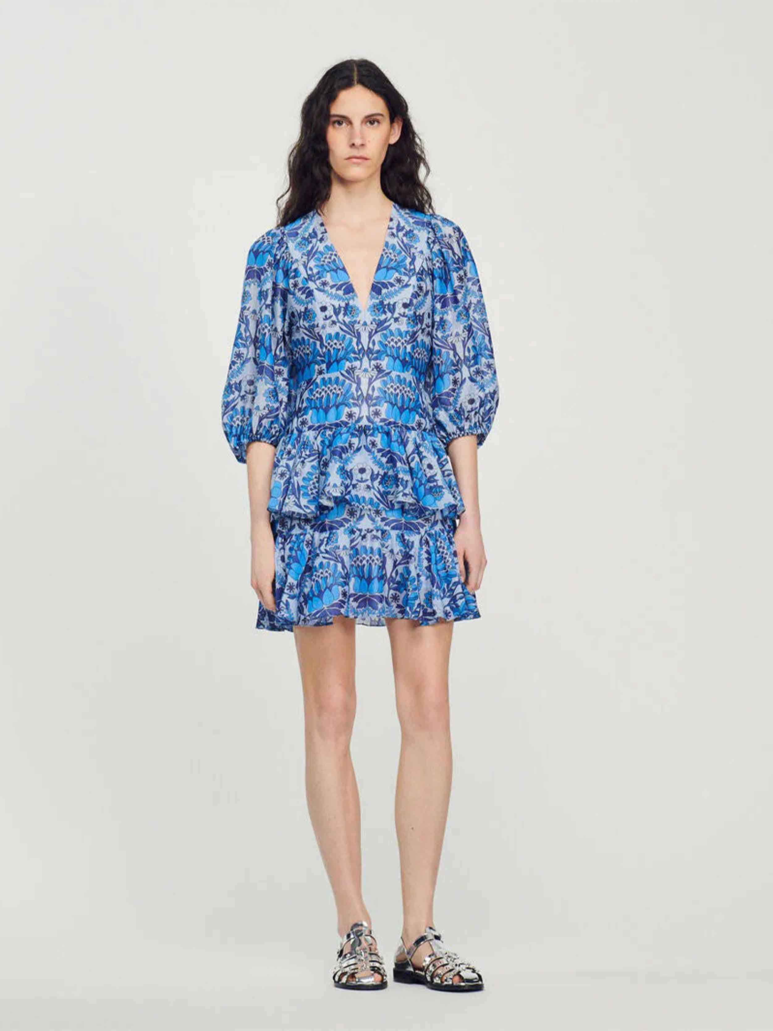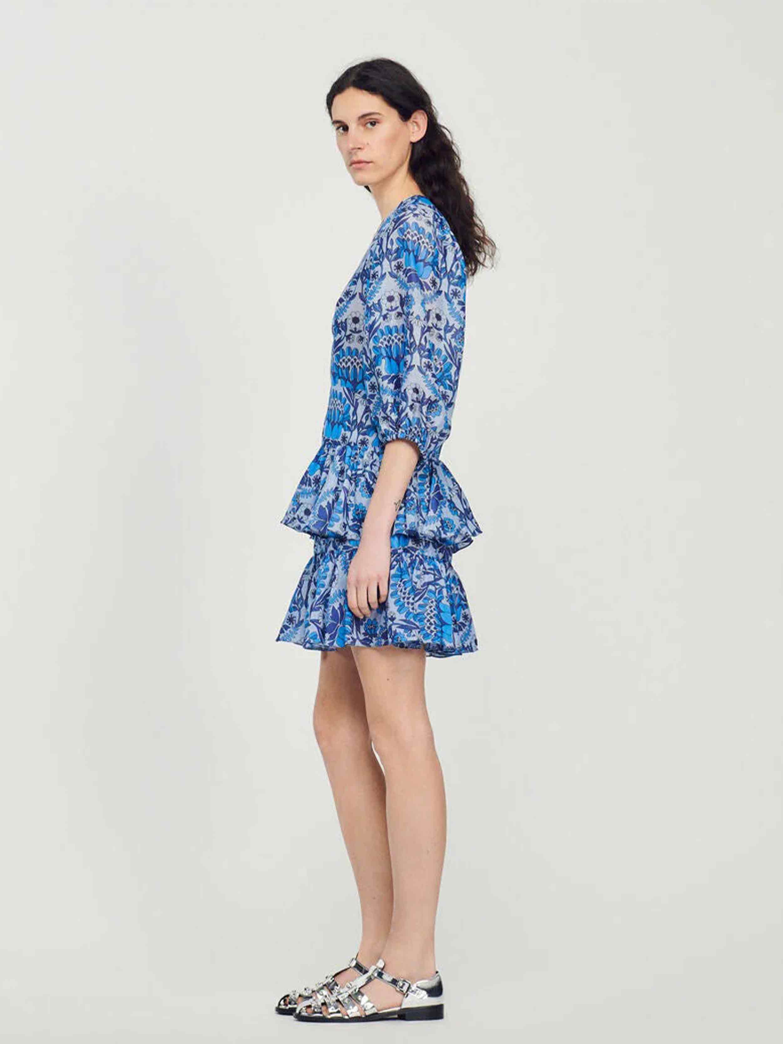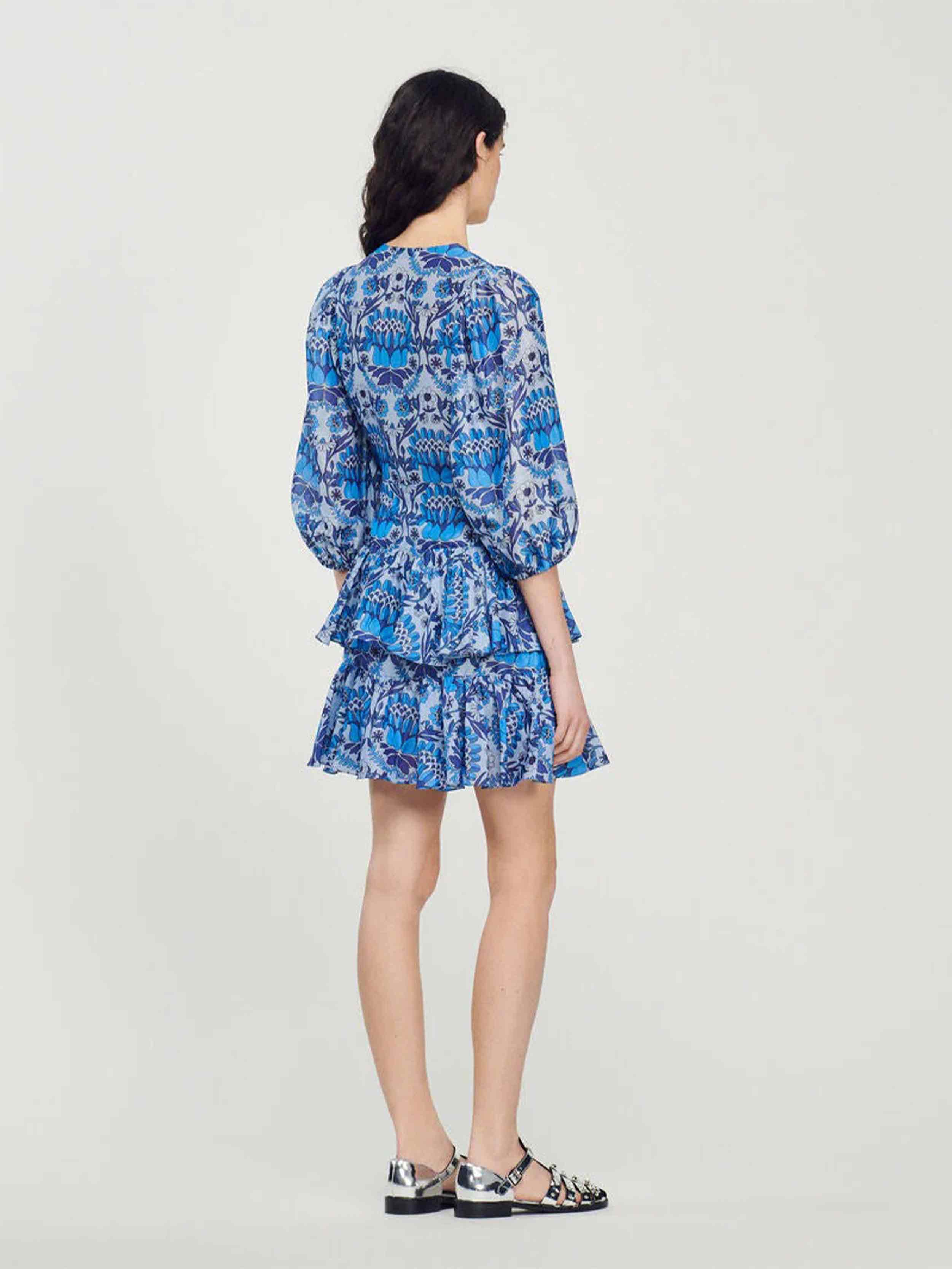 • Short dress with cut-outs on the top, with three-quarter elasticated puff sleeves, a ruffled skirt and embellished with a scarf print.
