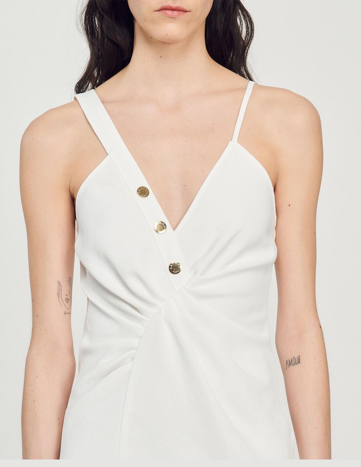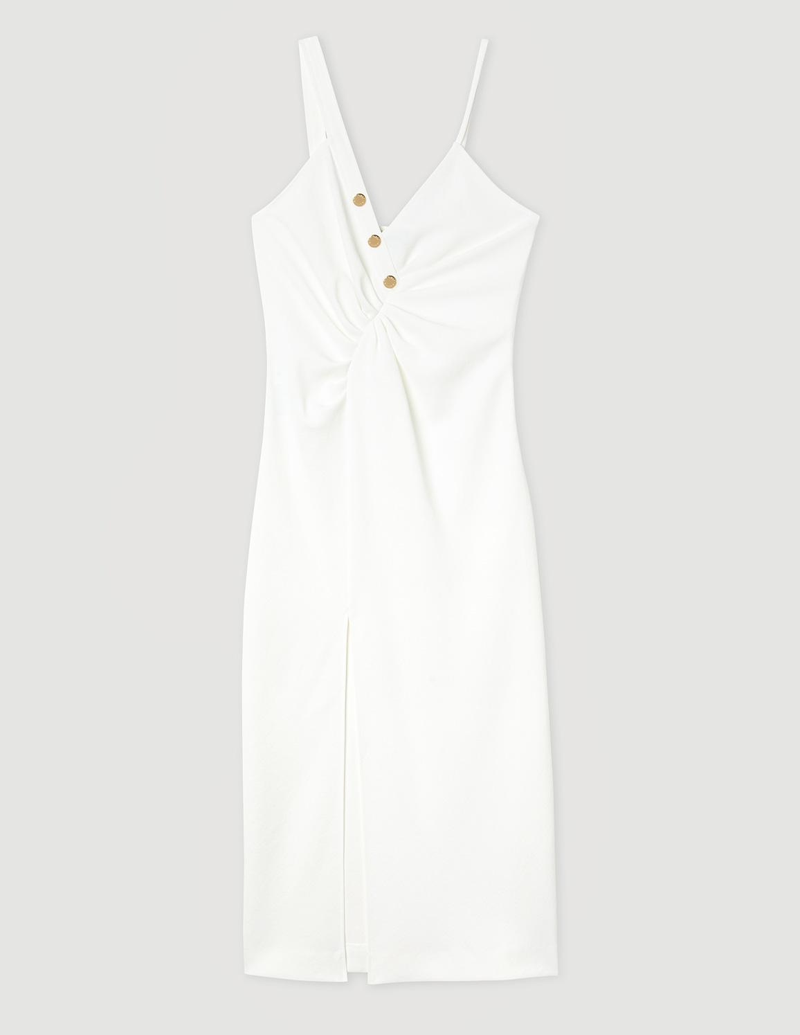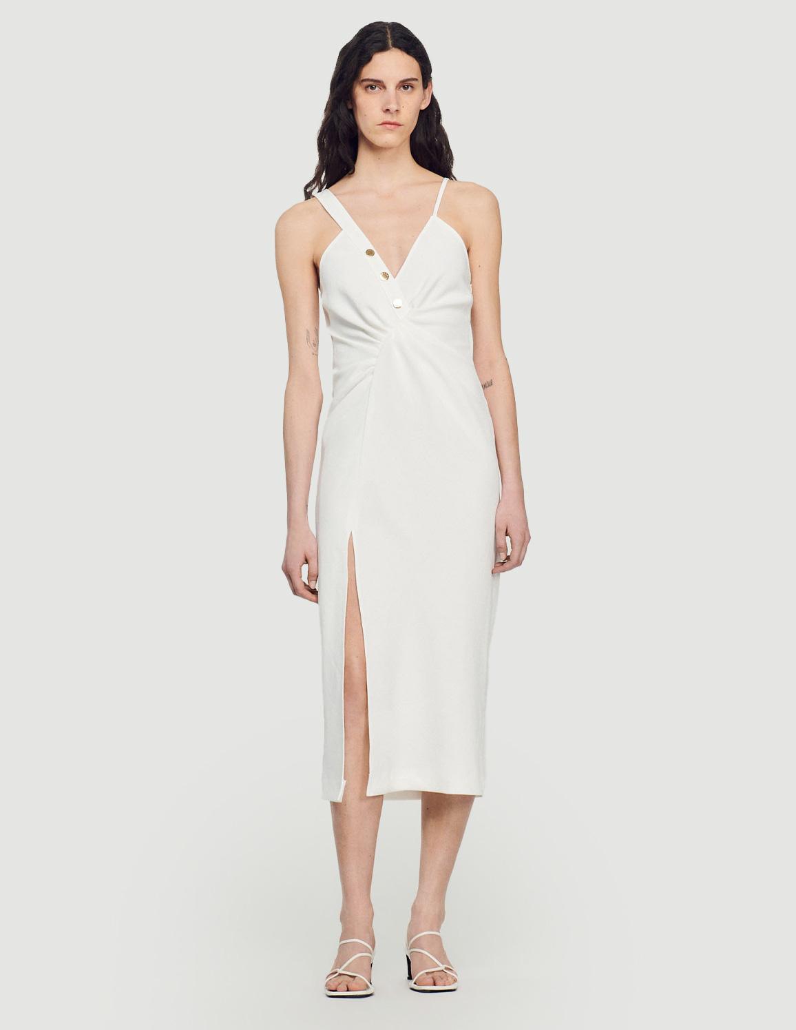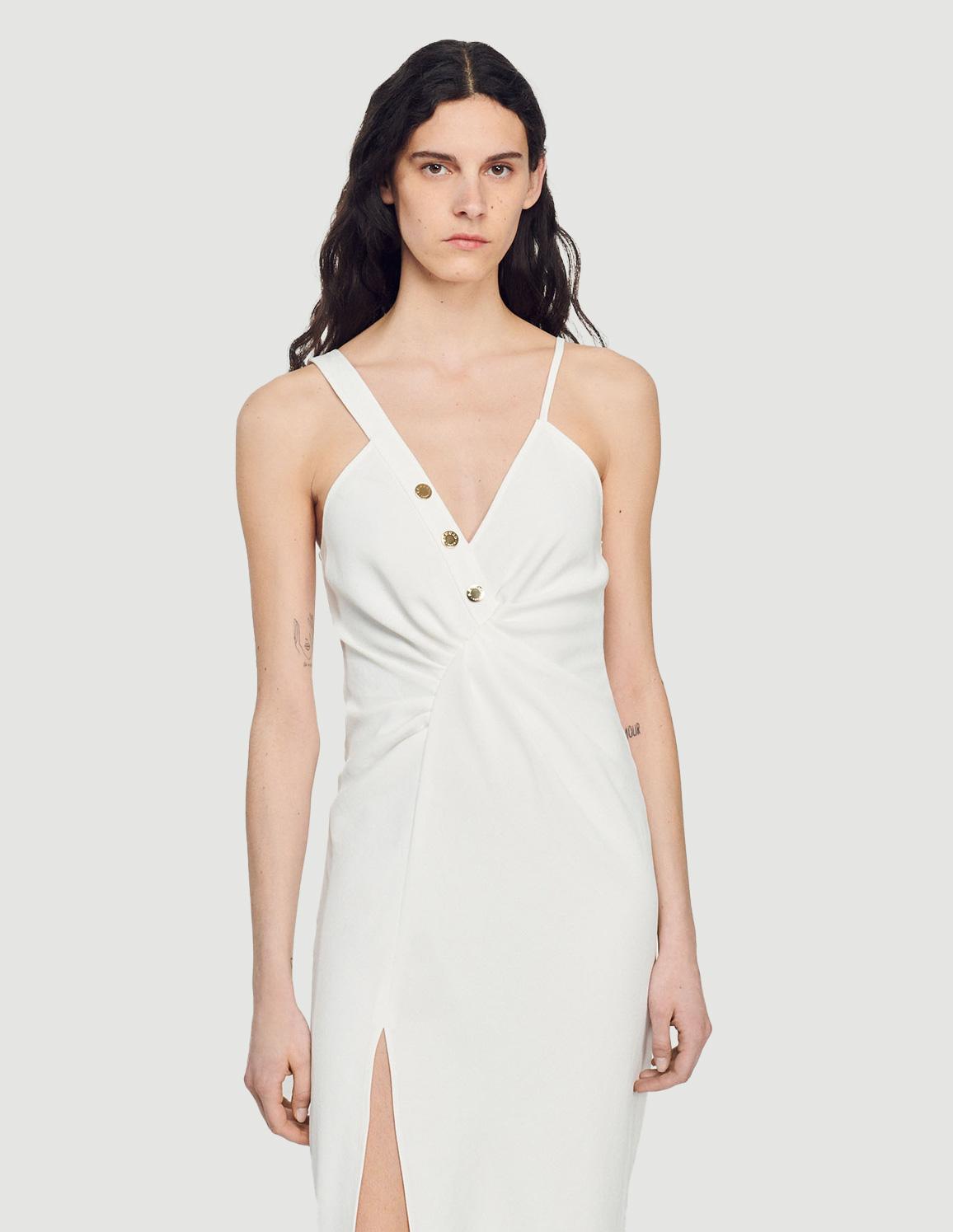 • Long dress with an asymmetrical V-shaped neckline featuring one wide strap and one narrow strap, a button placket with branded gold buttons, and a front slit.