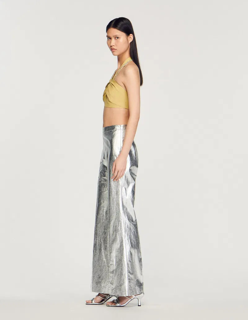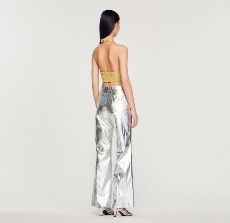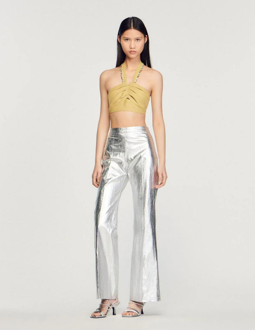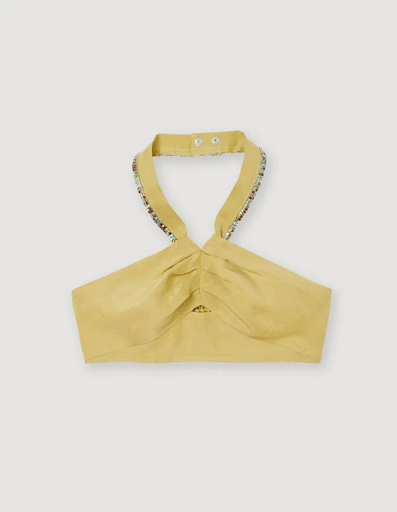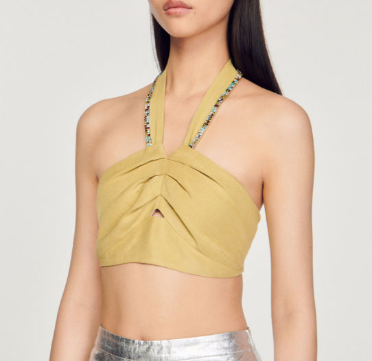 • Gathered crop top with one wide halterneck strap embellished with multicolored rhinestone trim.