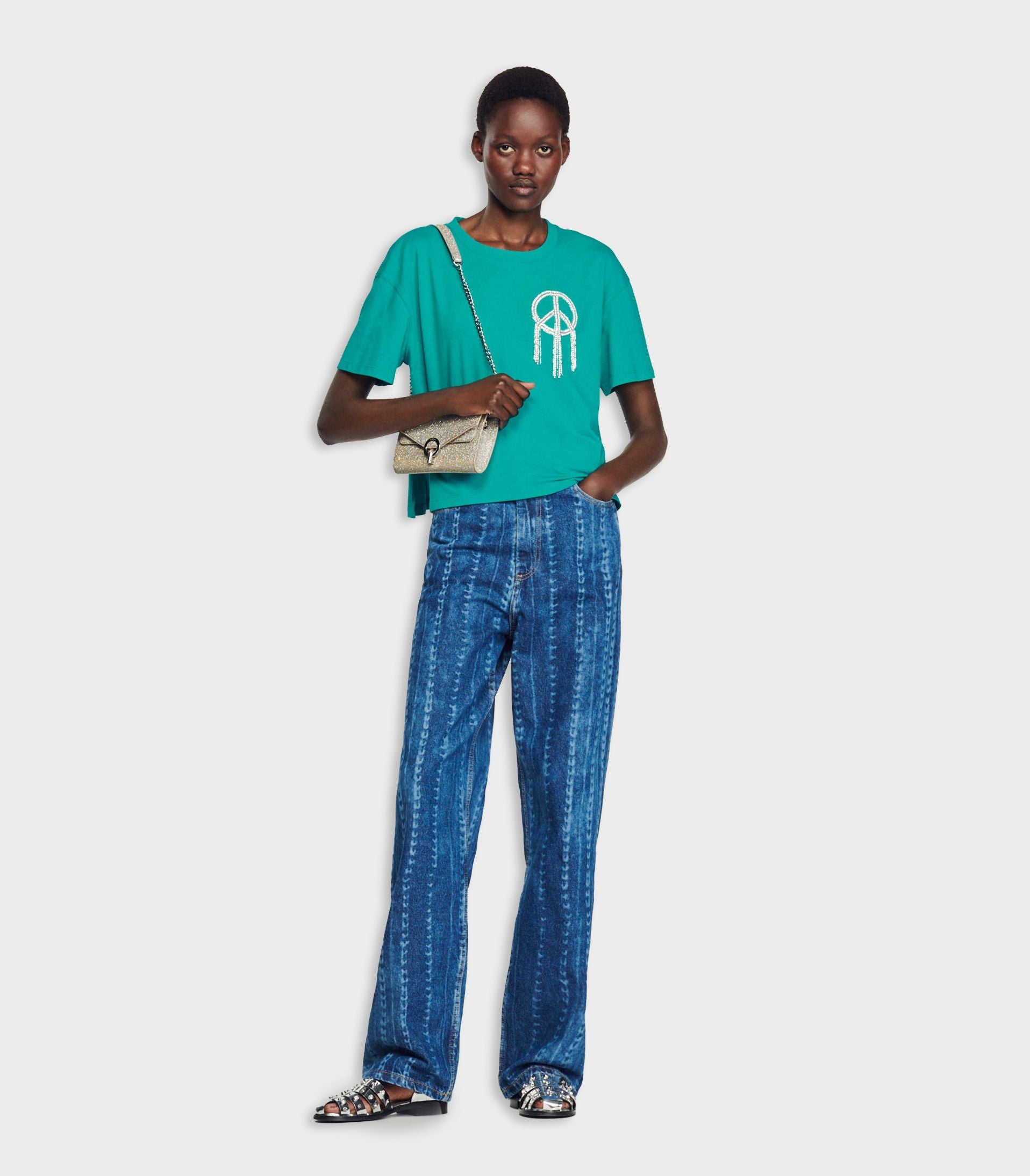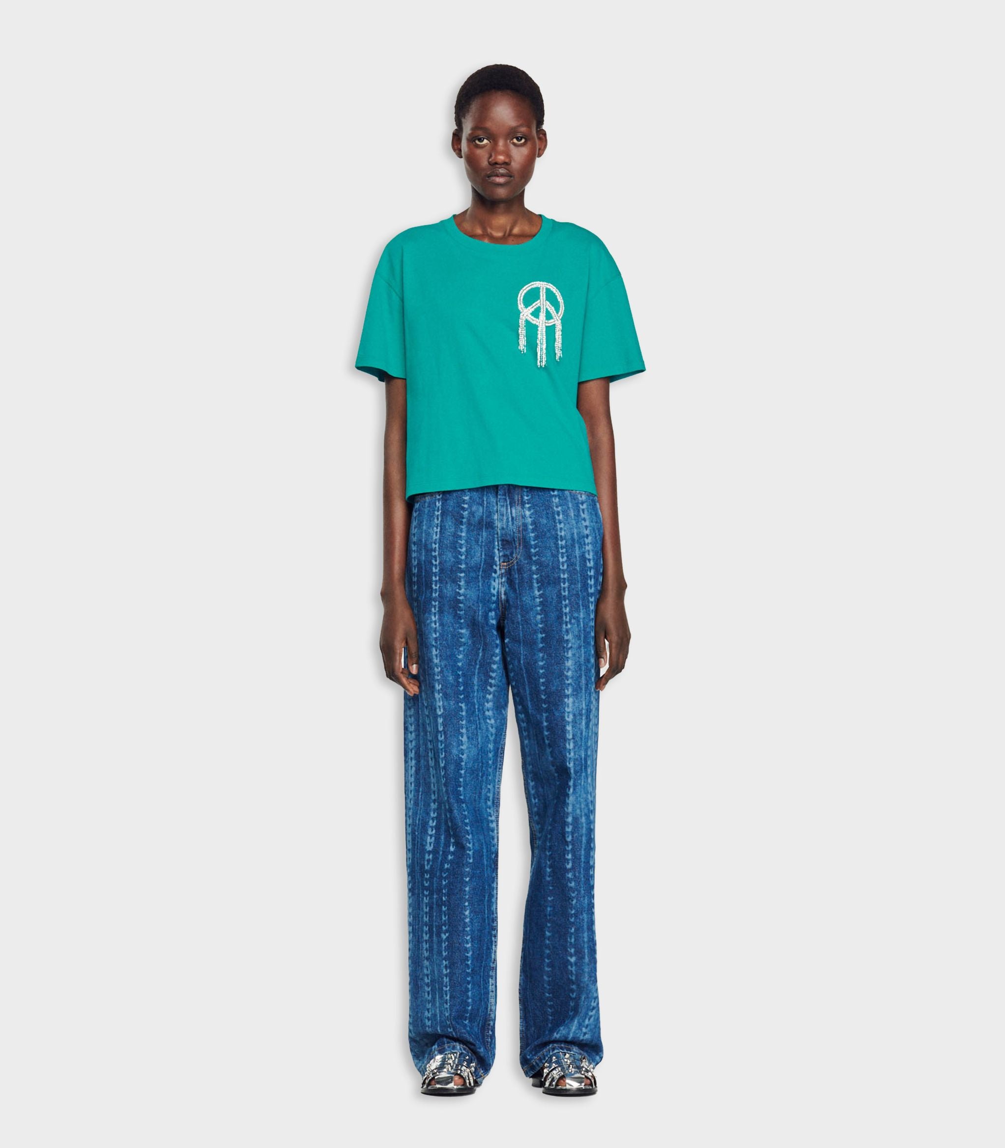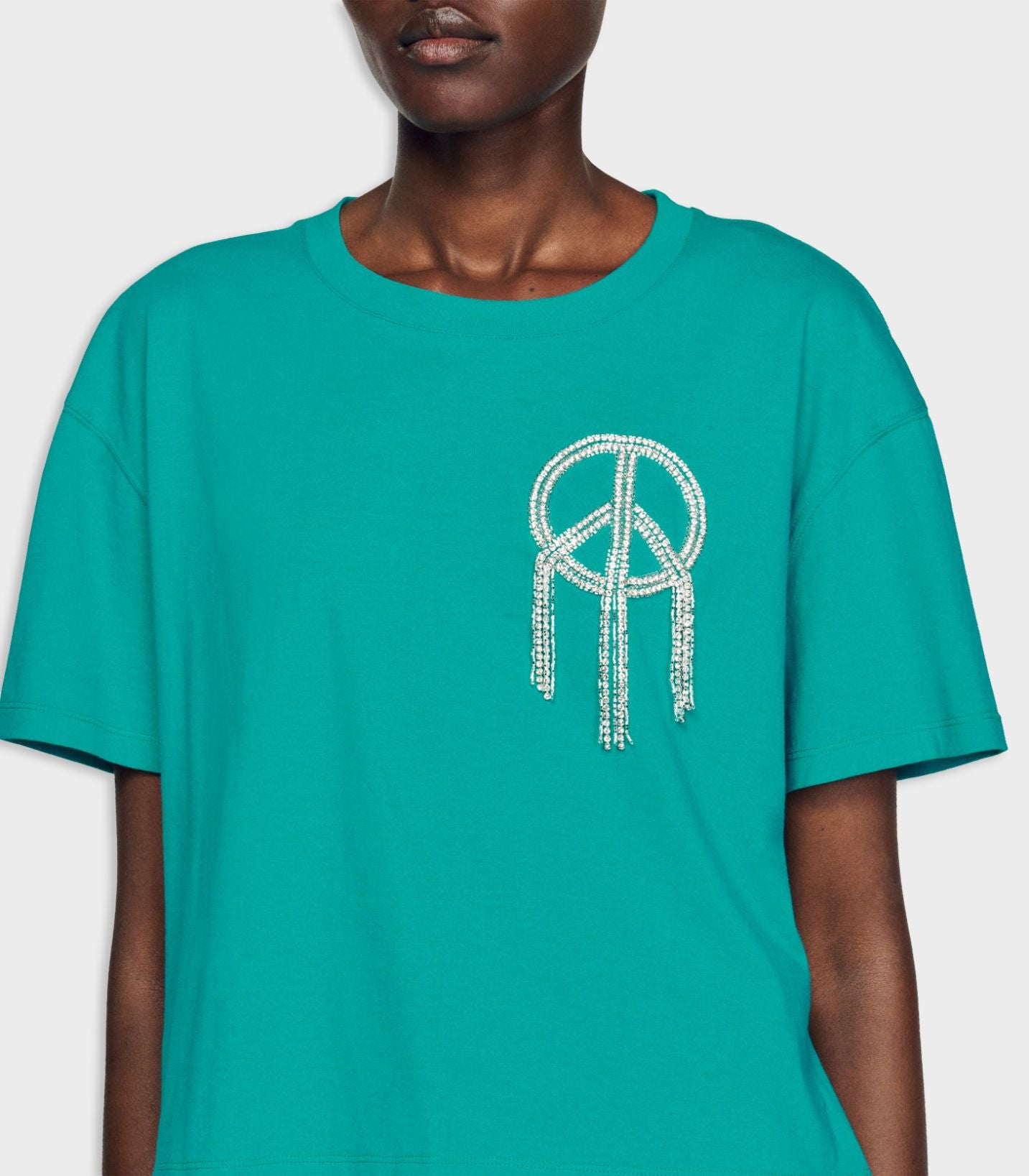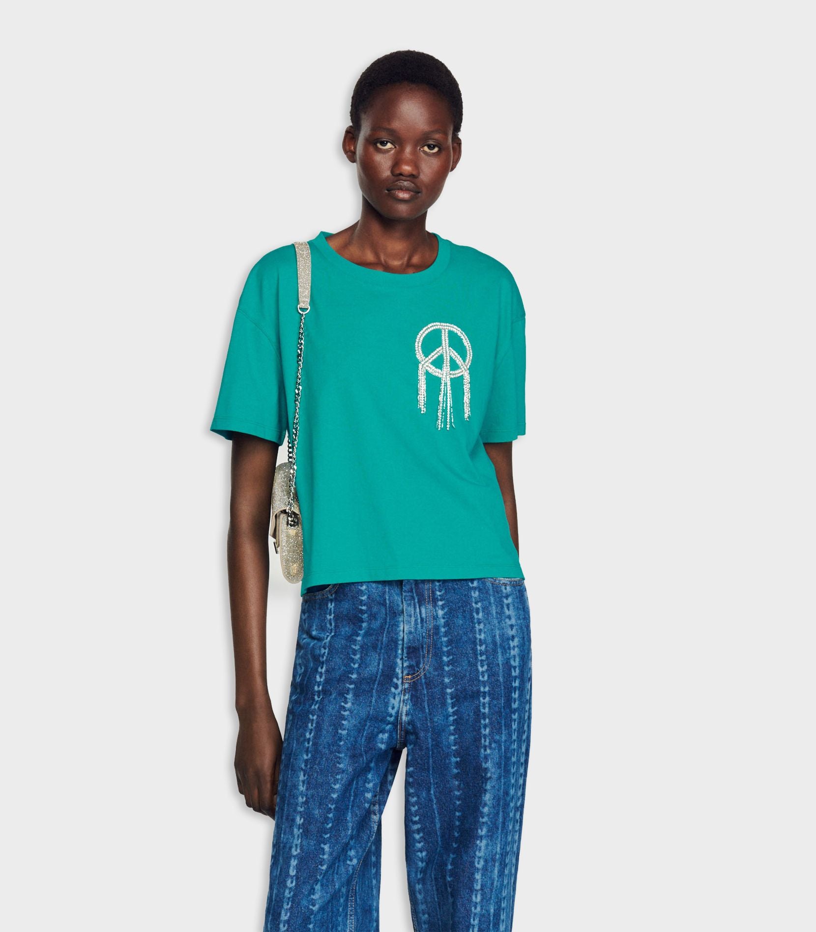• Baggy T-shirt with a round neck, short sleeves, and a "peace and love" detail in fringe and rhinestones.