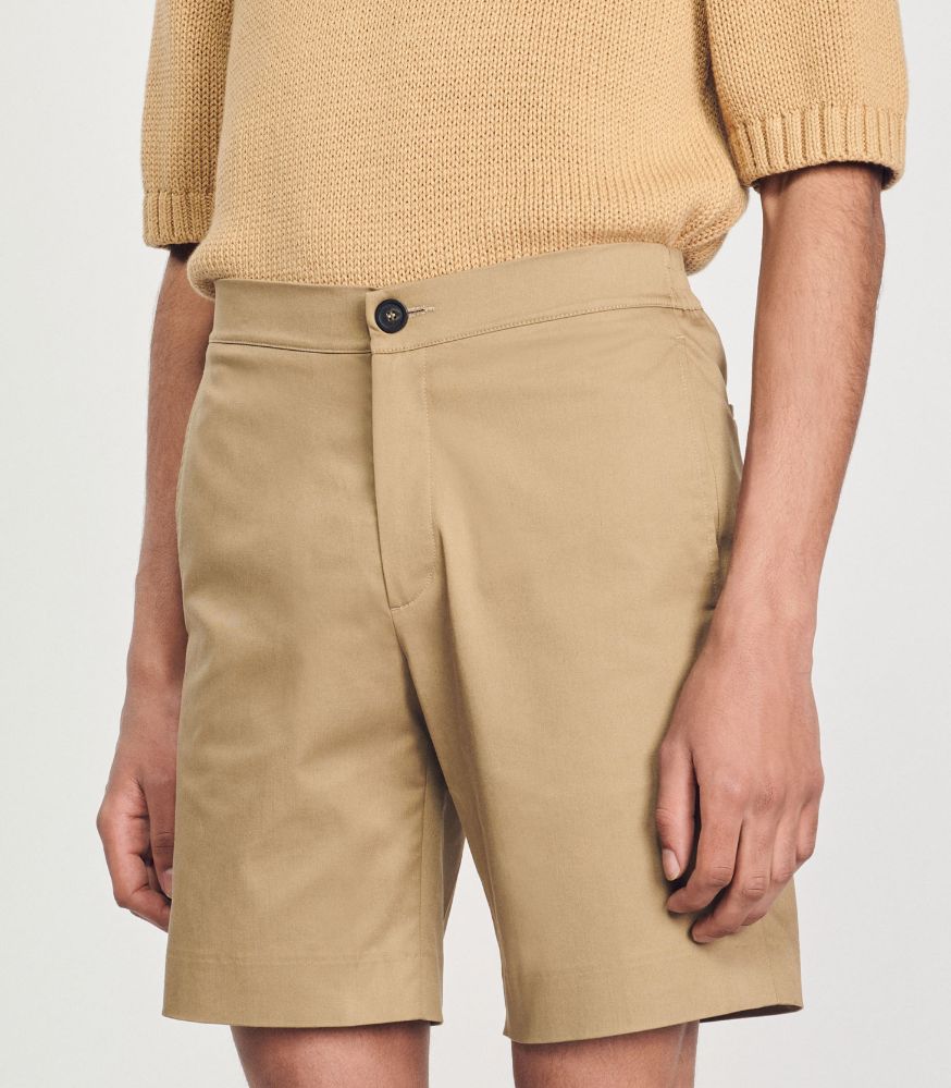 • Cotton shorts with an elasticated waist at the back, side pockets, and piped back pockets.