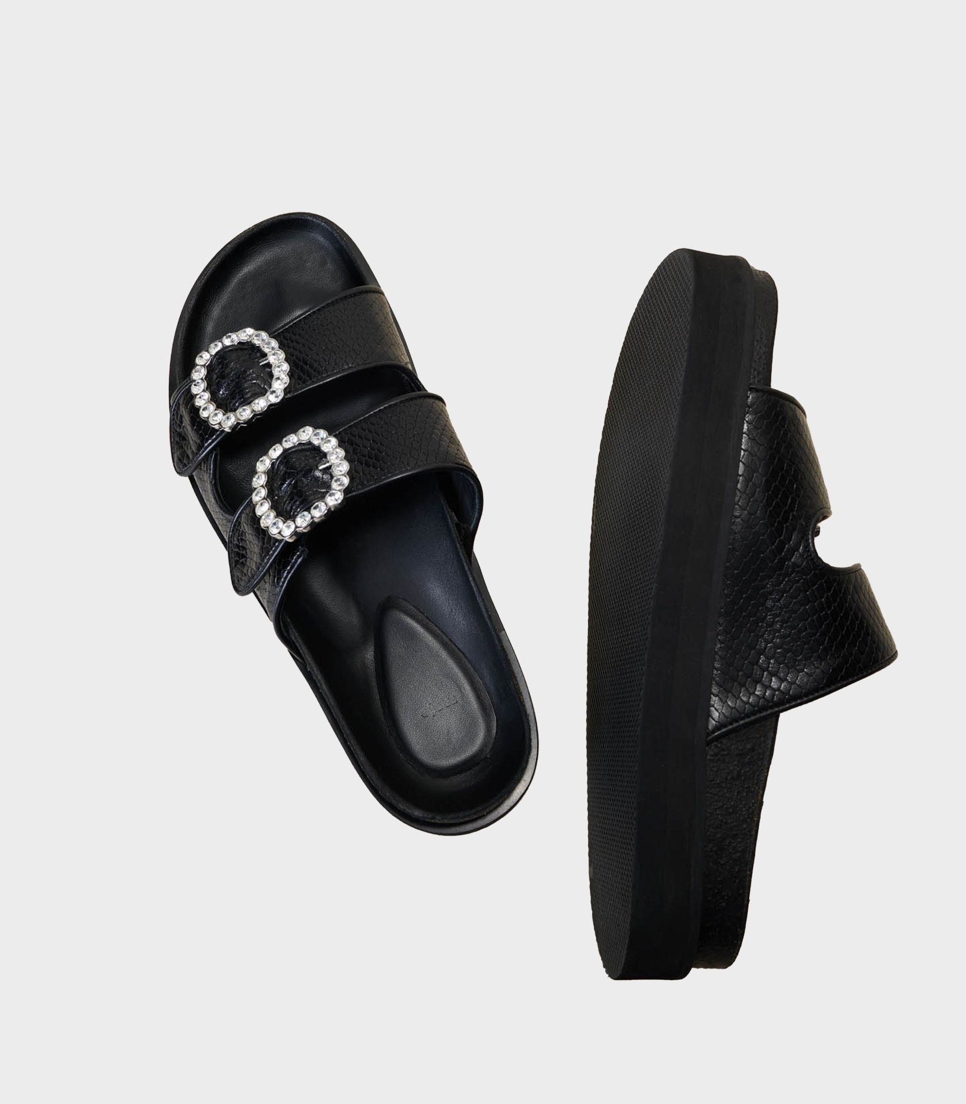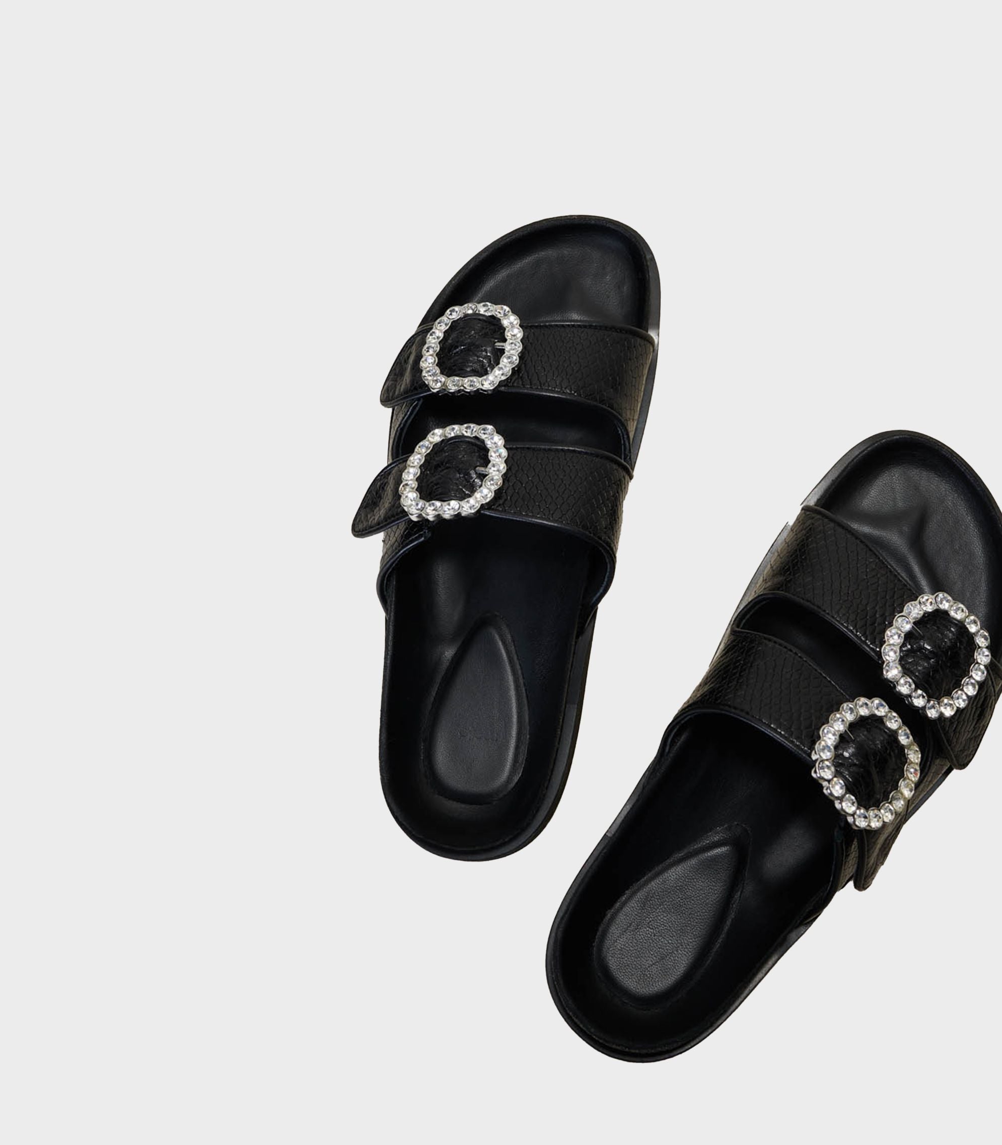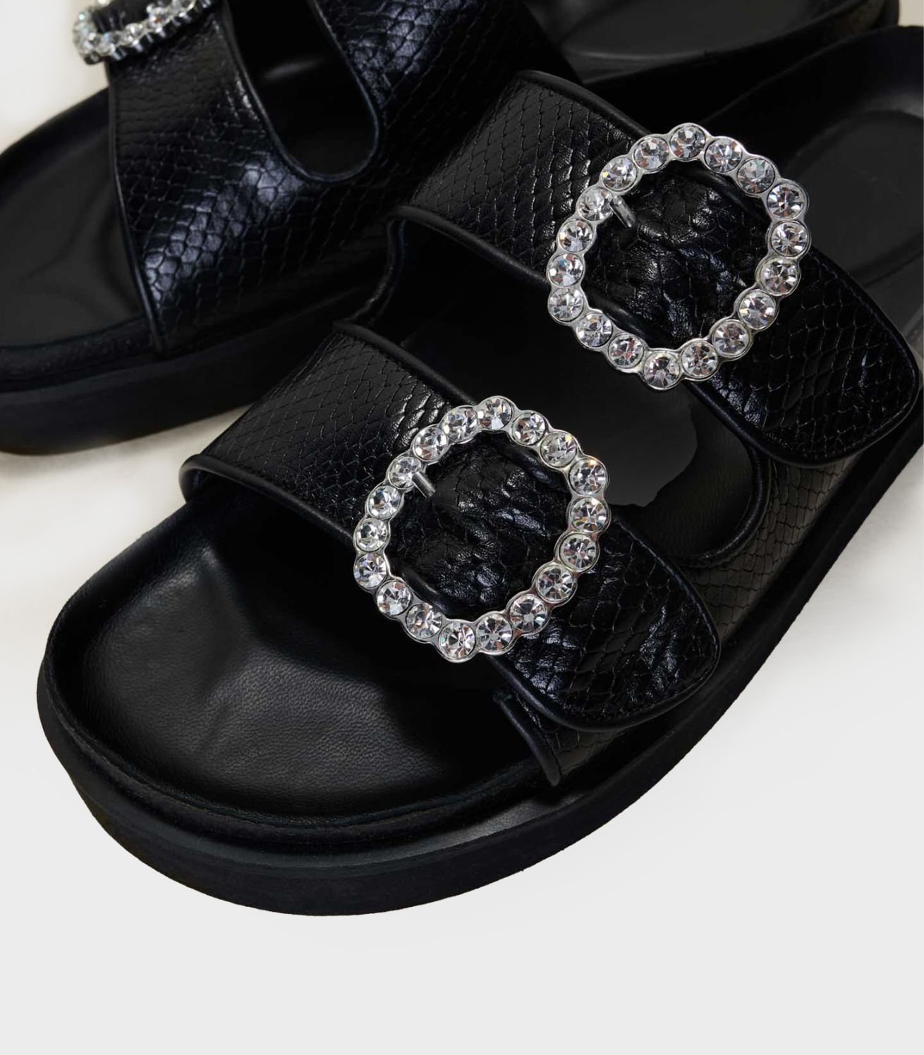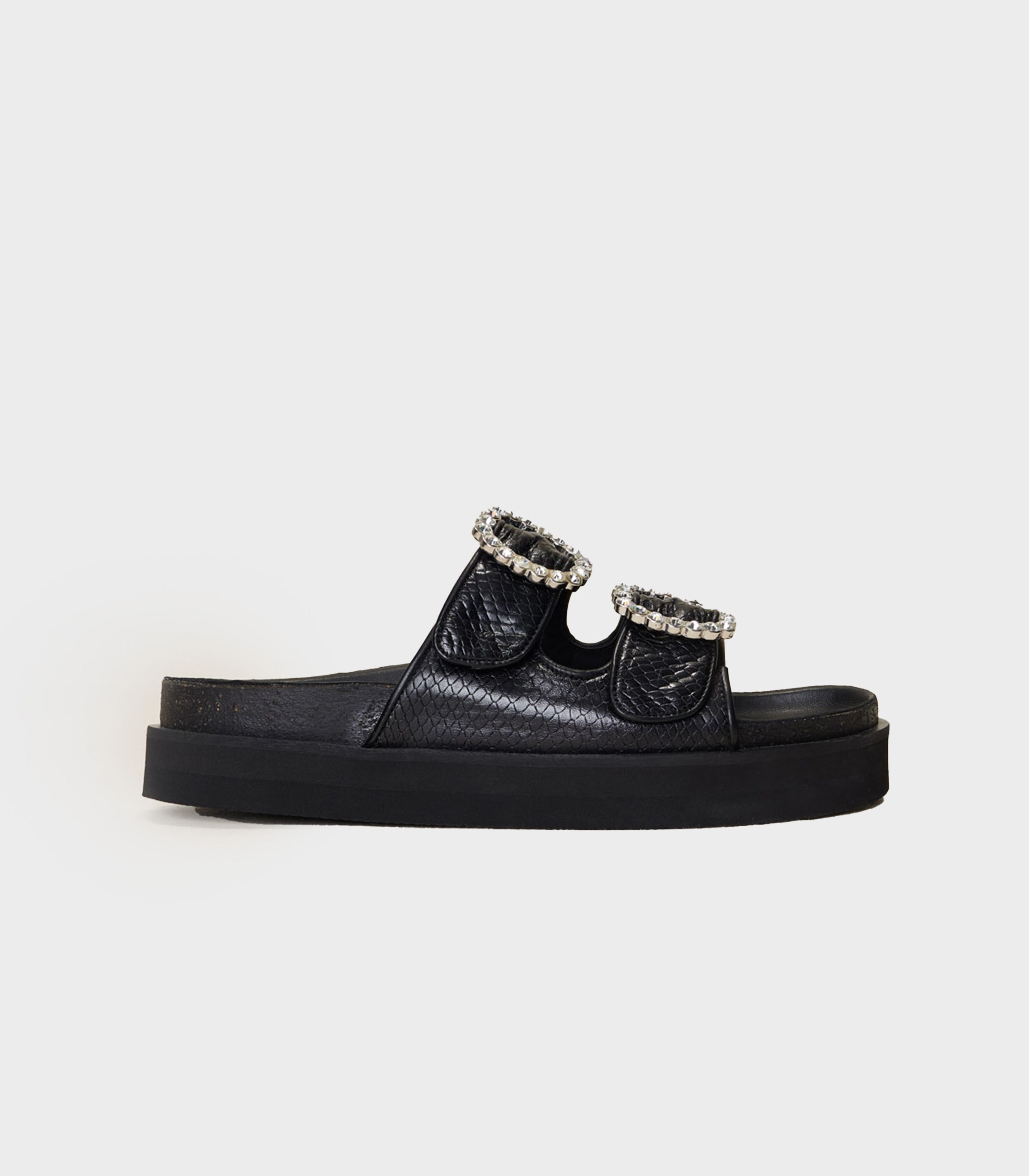 • Wardrobe must-haves, these wedge sandals with rhinestone buckles go as well with casual jeans as a floral dress. Made from crocodile-effect leather, they have two adjustable straps and are embellished with buckles set with sparkling crystals, a nod to the iconic Fardi heeled mules.