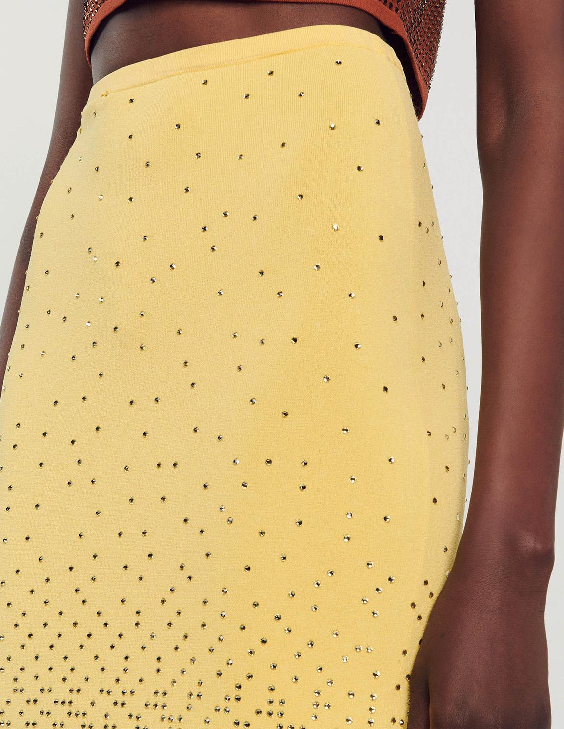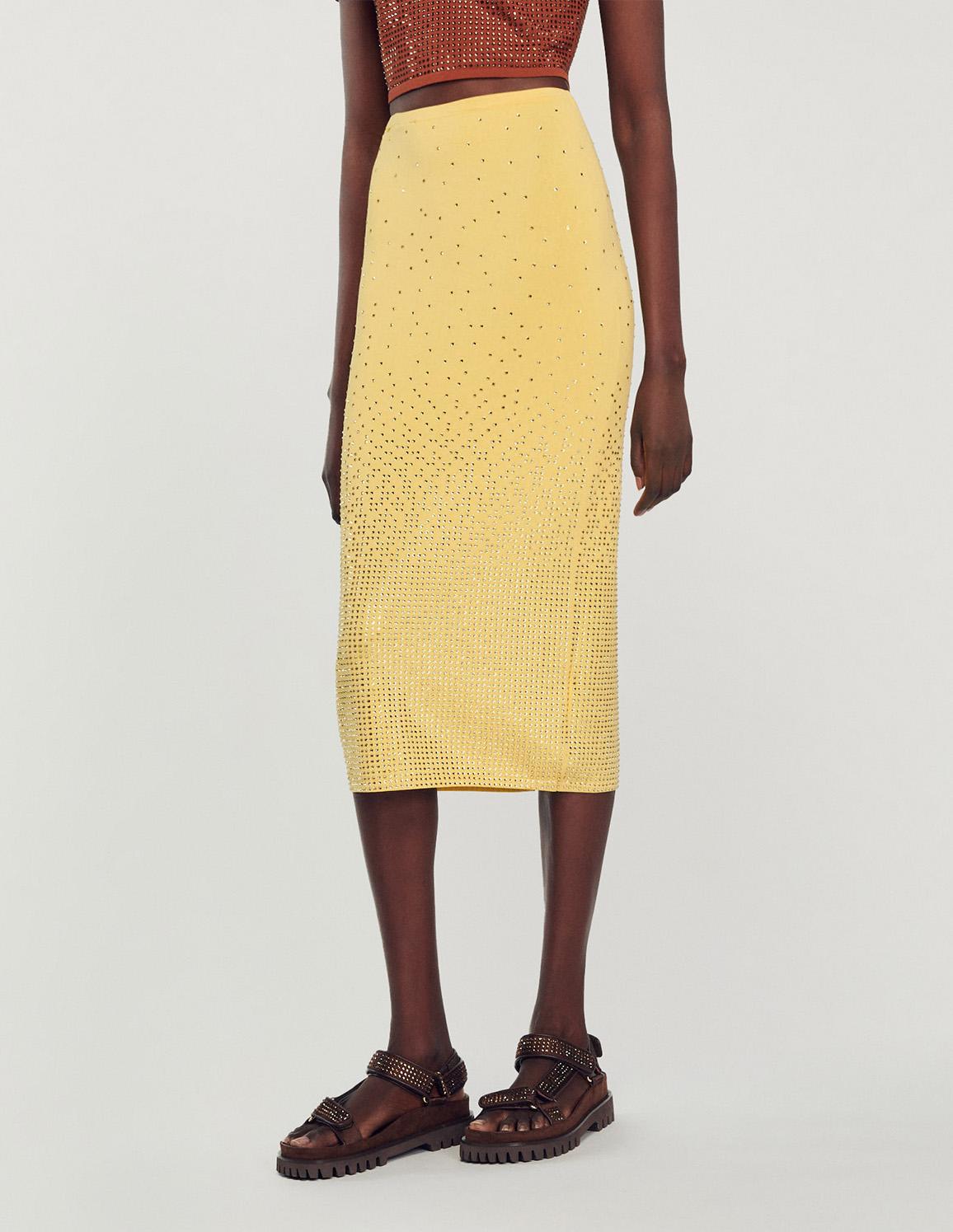 • Figure-hugging stretch-knit midi skirt, embellished with all-over rhinestones.