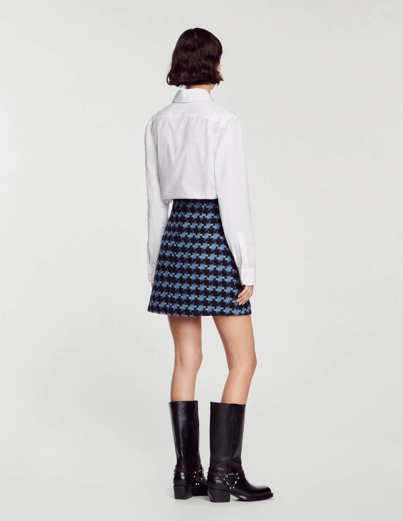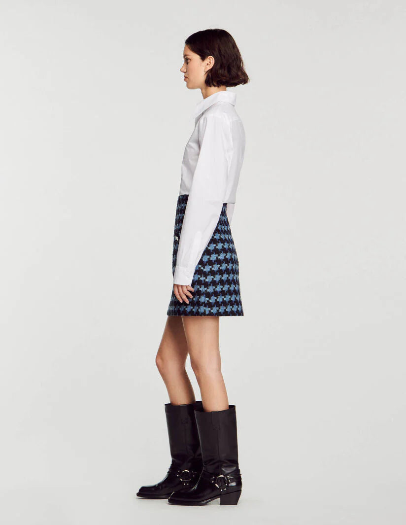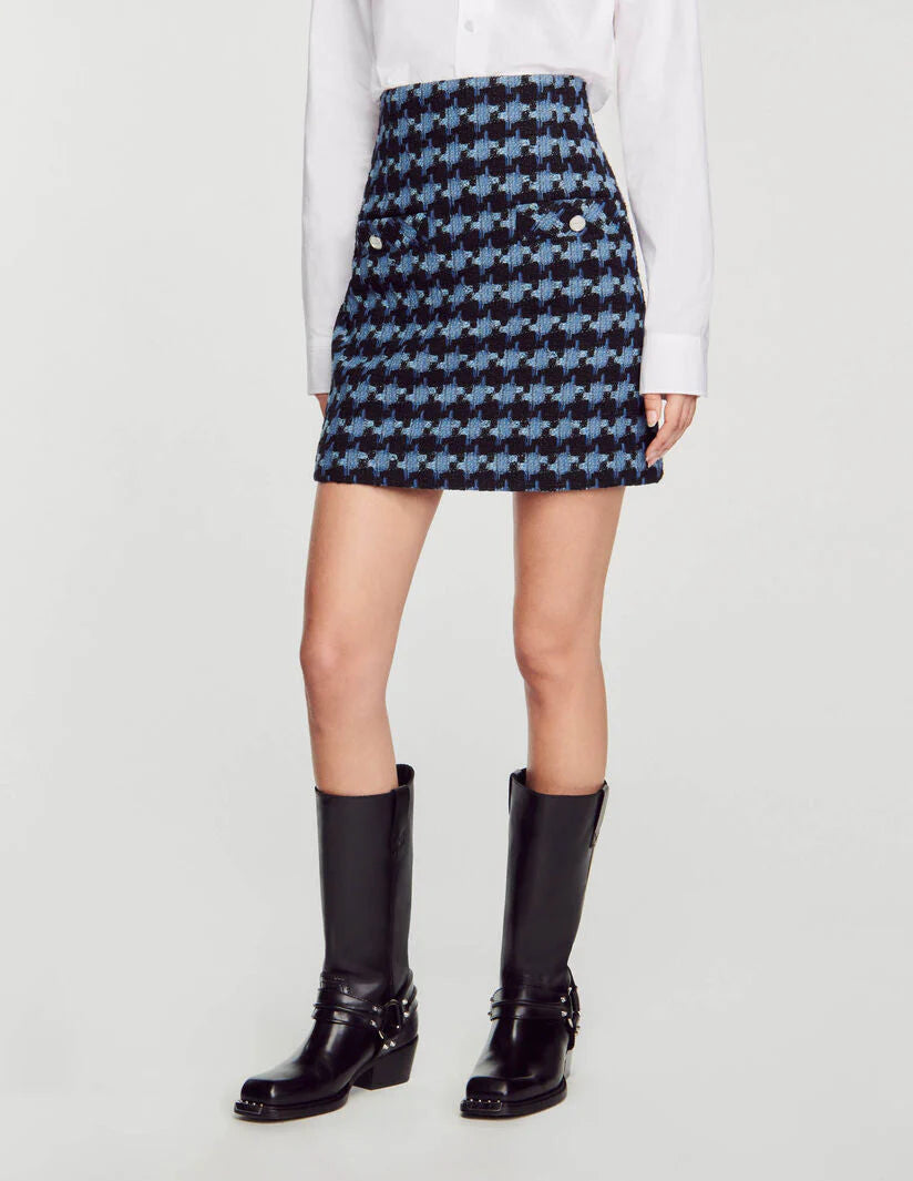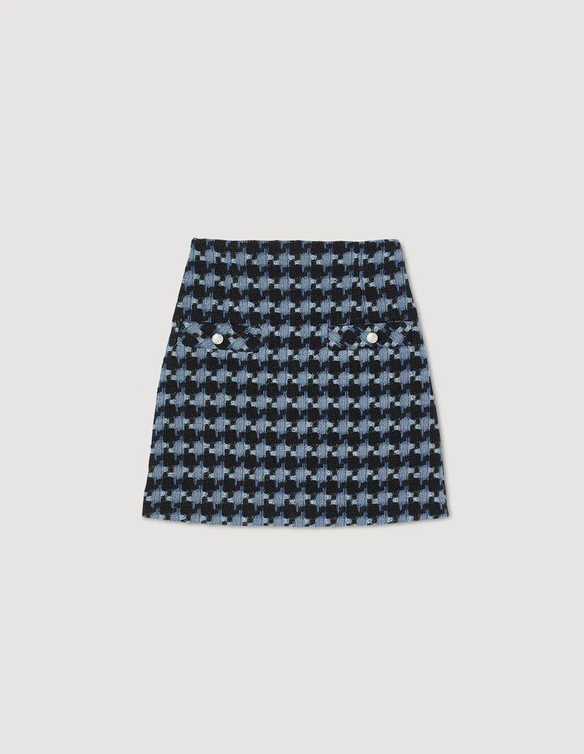 • Short tweed skirt with a houndstooth pattern and piped pockets with buttons on the waist