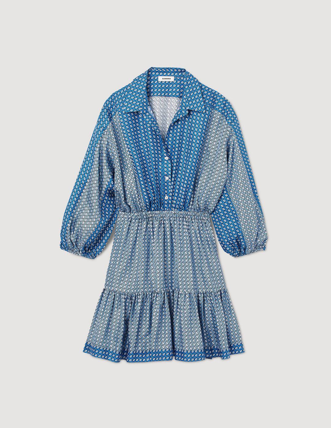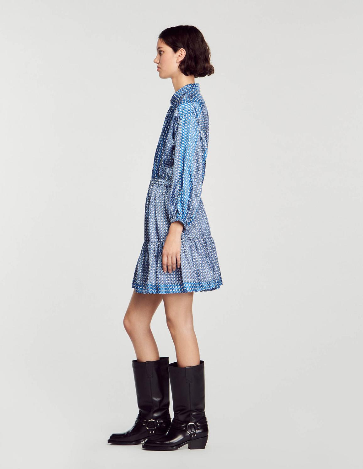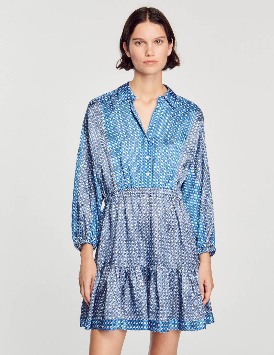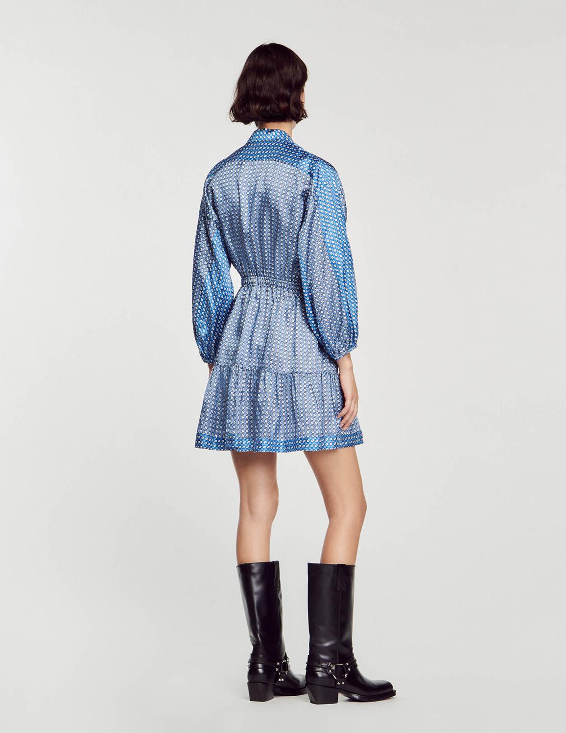 • Short satin dress with long sleeves, an open buttoned shirt collar, a flared skirt, an elasticated waist, and an all-over tie print.
