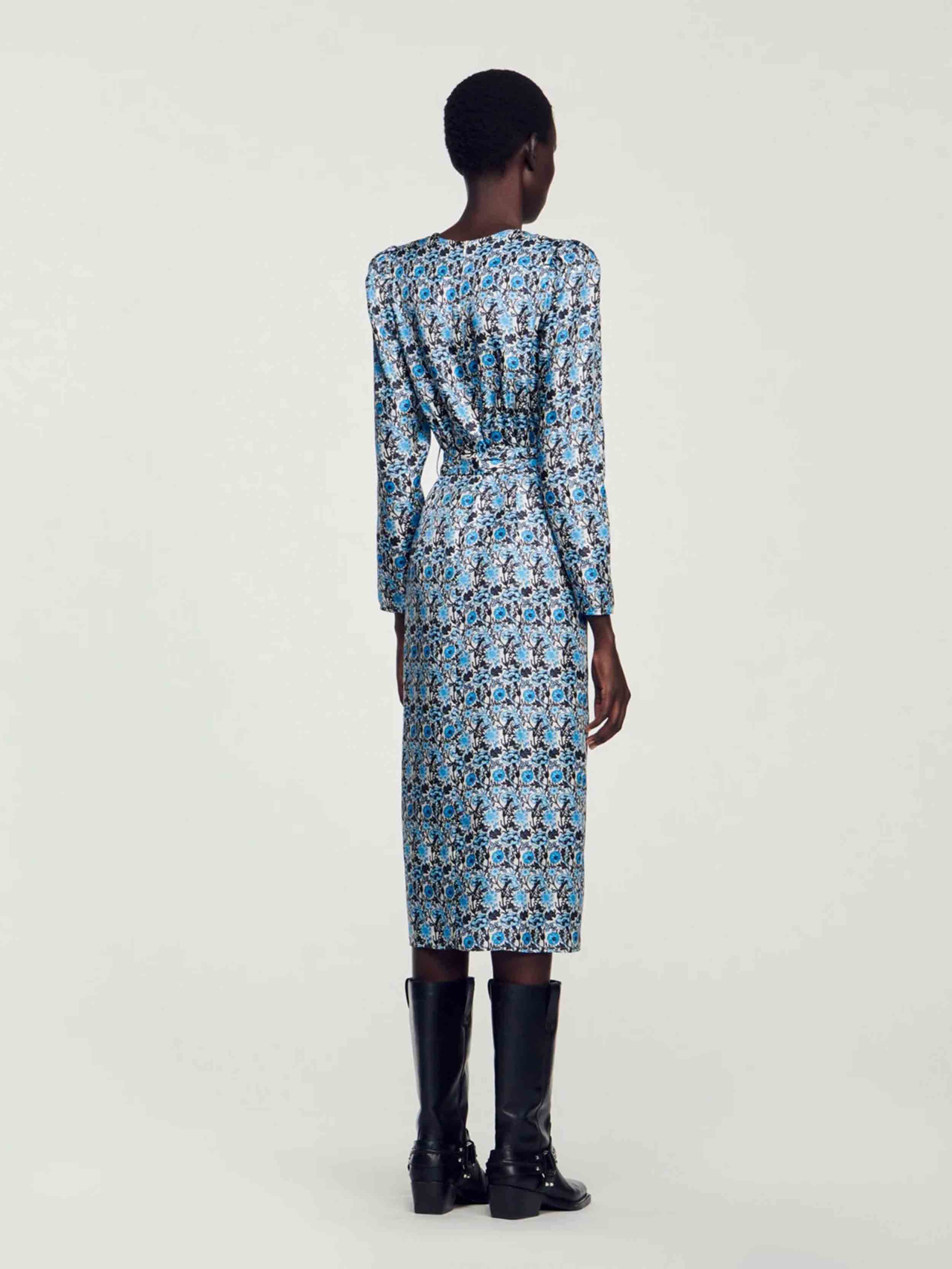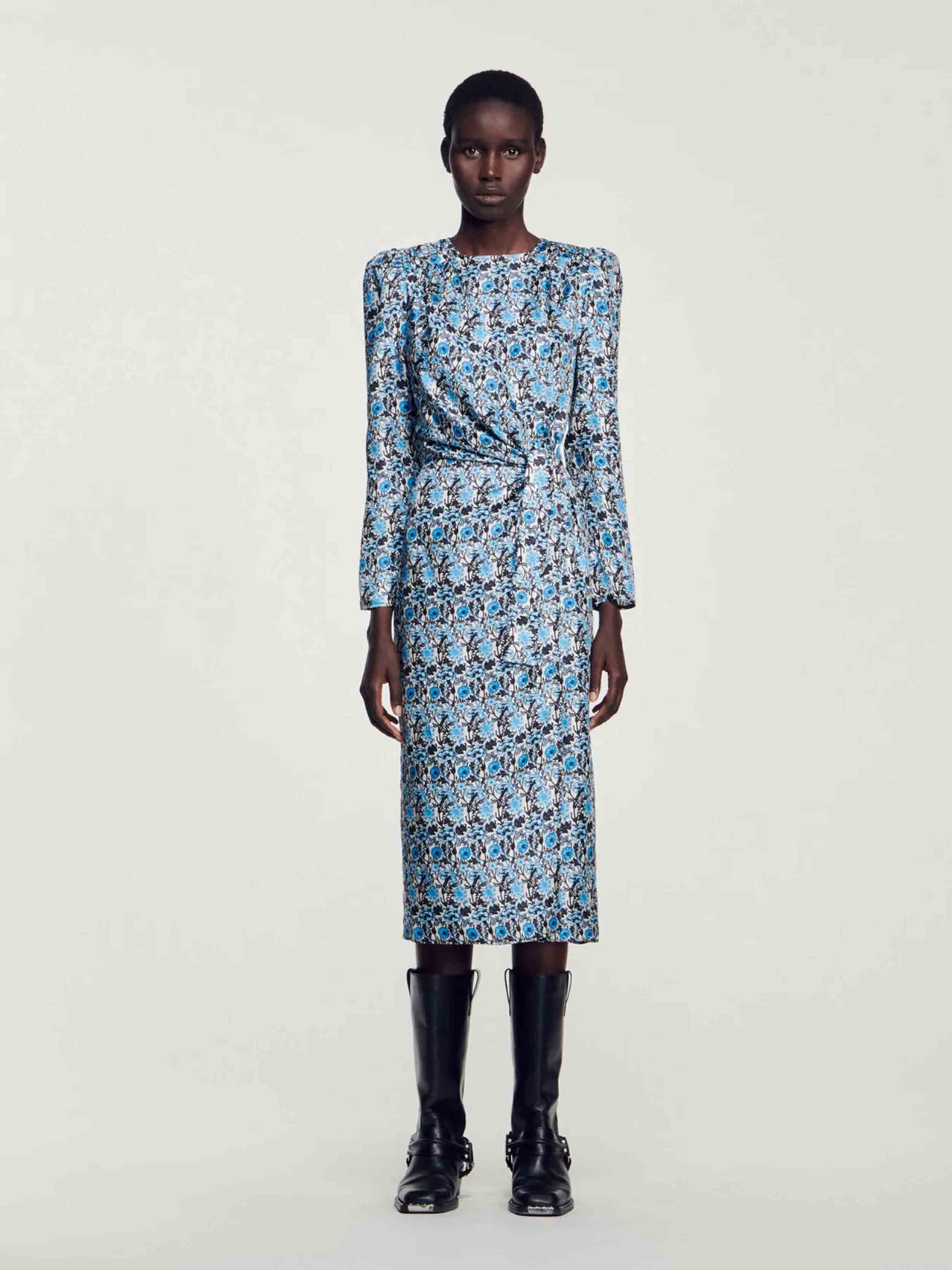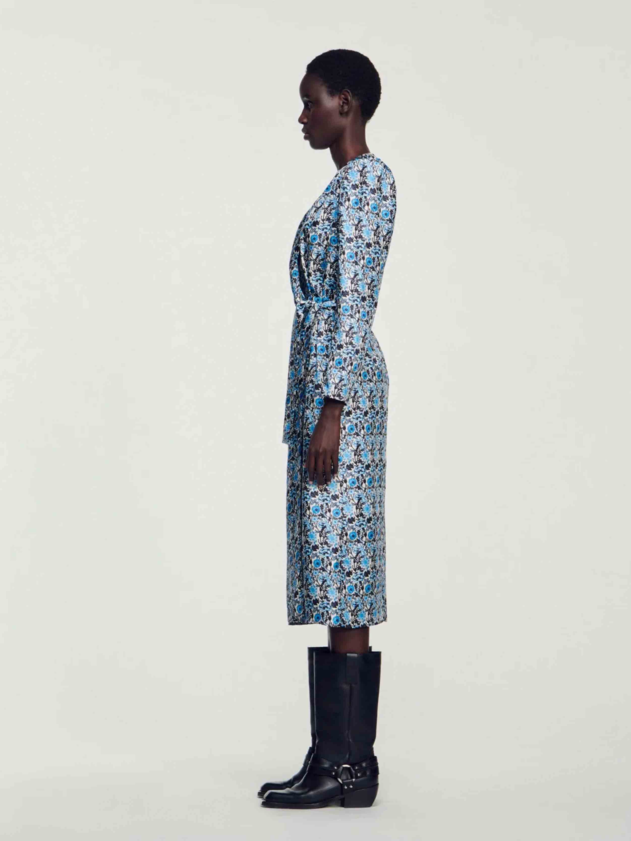 • Long silk dress with a round neck, long sleeves, an all-over "Blue Blossom" print, gathering on the front, and a slit.