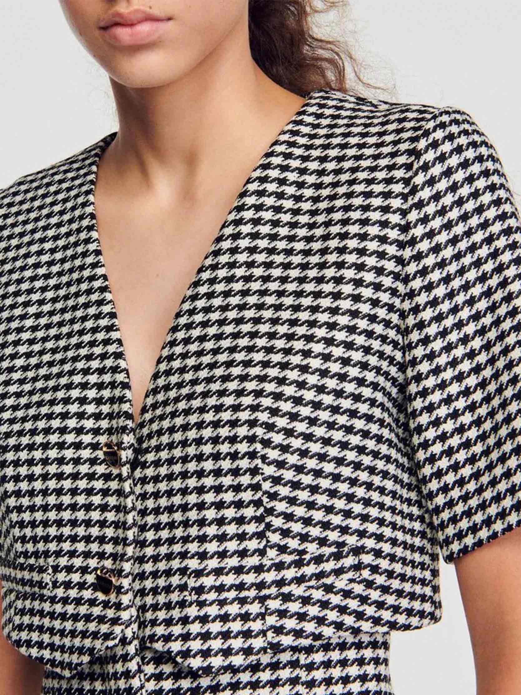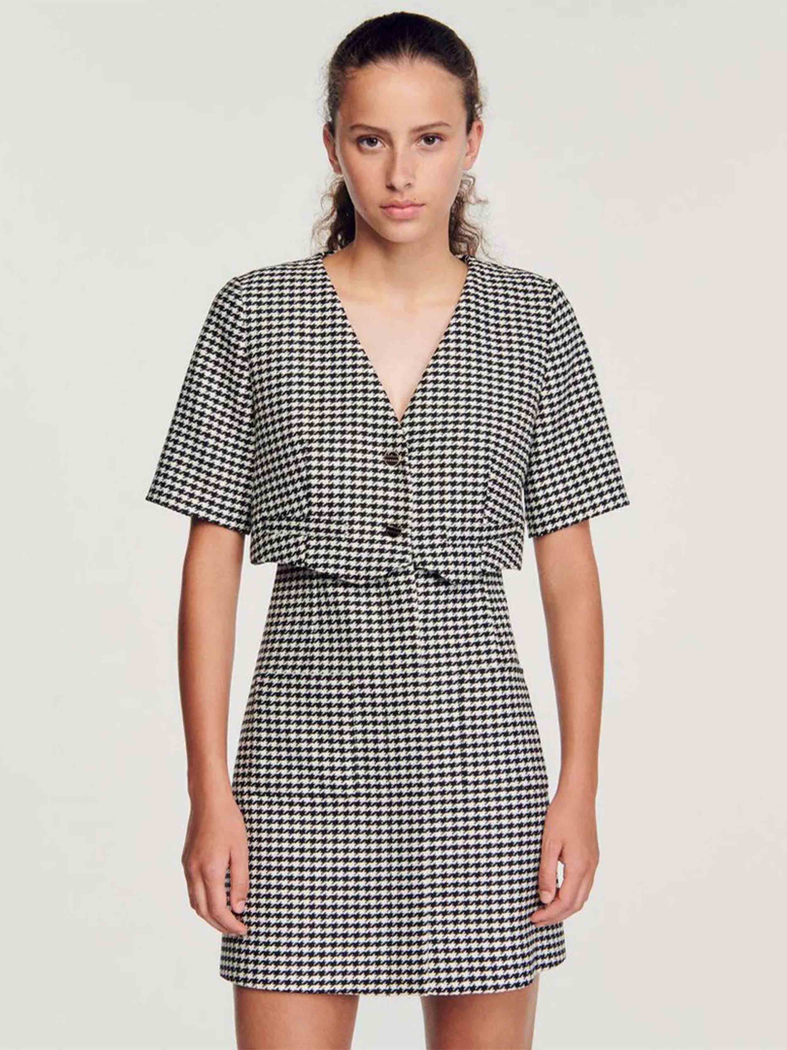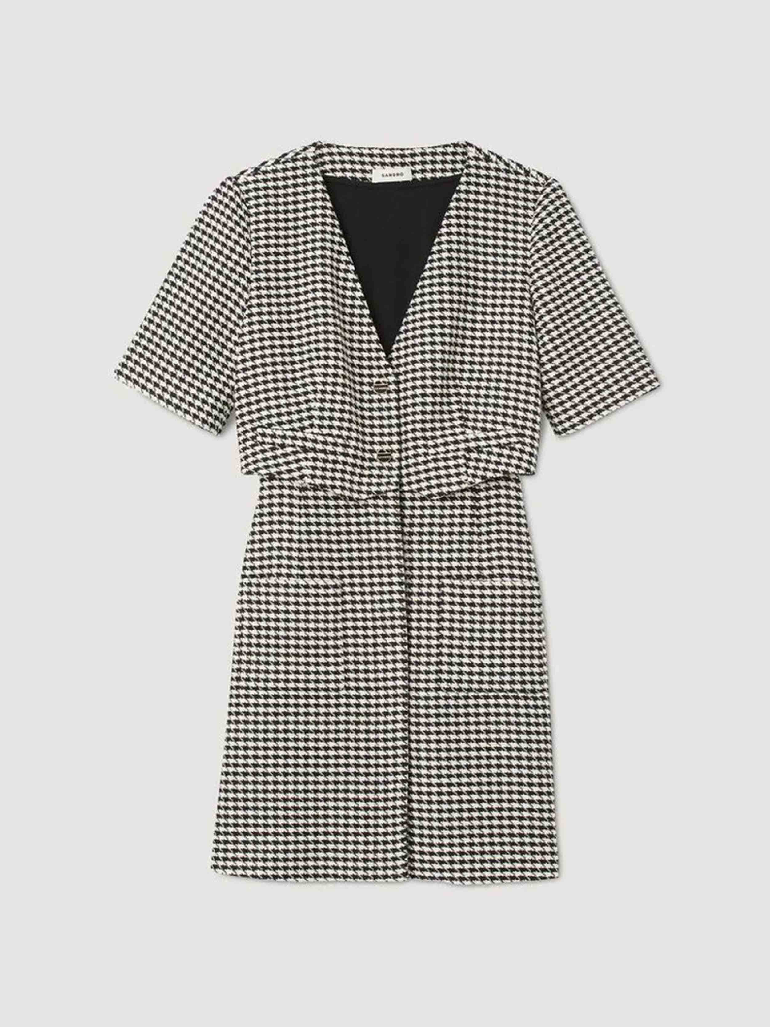 • Short houndstooth tweed 2-in-1 dress featuring a layered top with a crossover V-shaped neckline and buttons, short sleeves, and a straight-cut skirt.