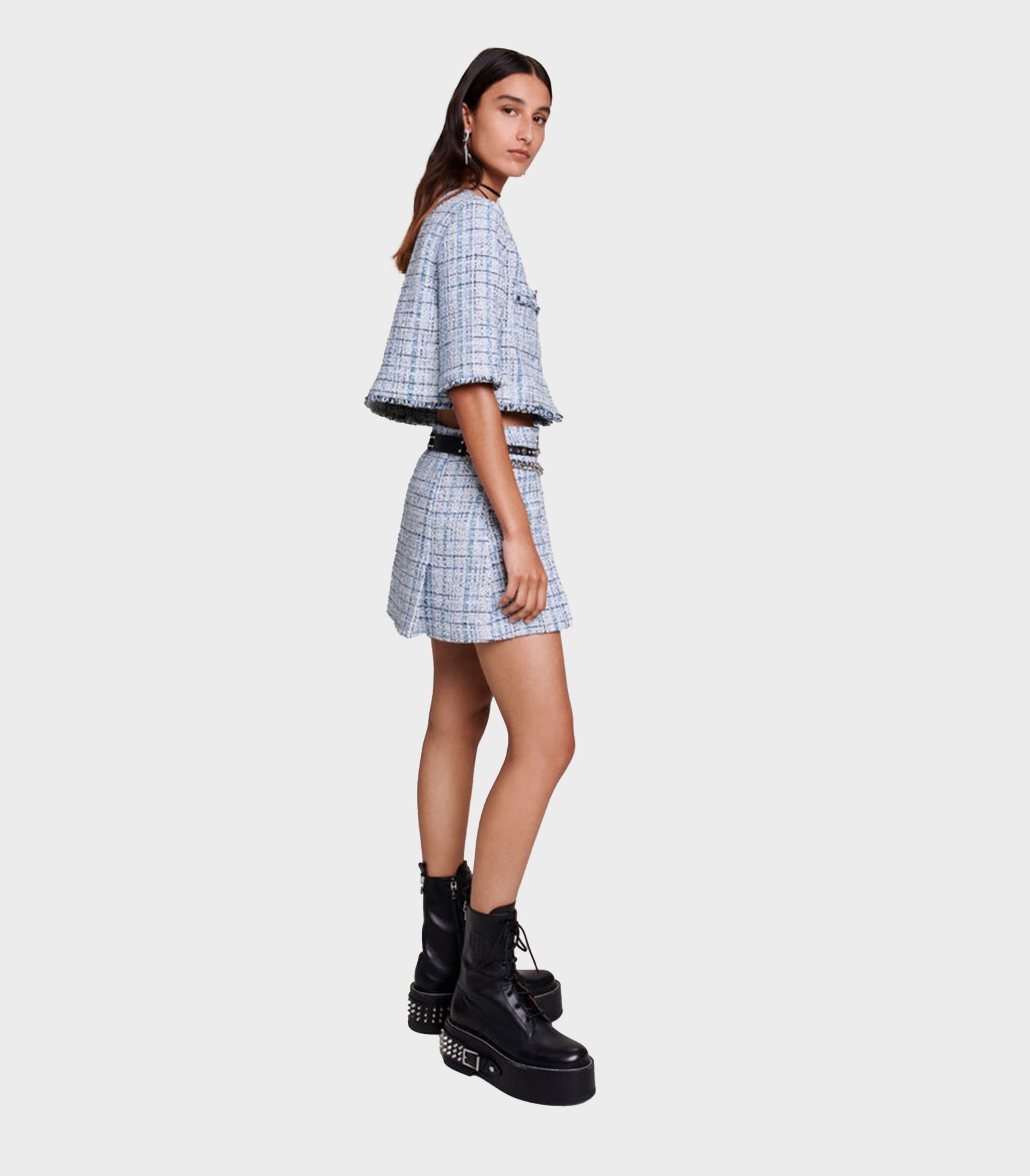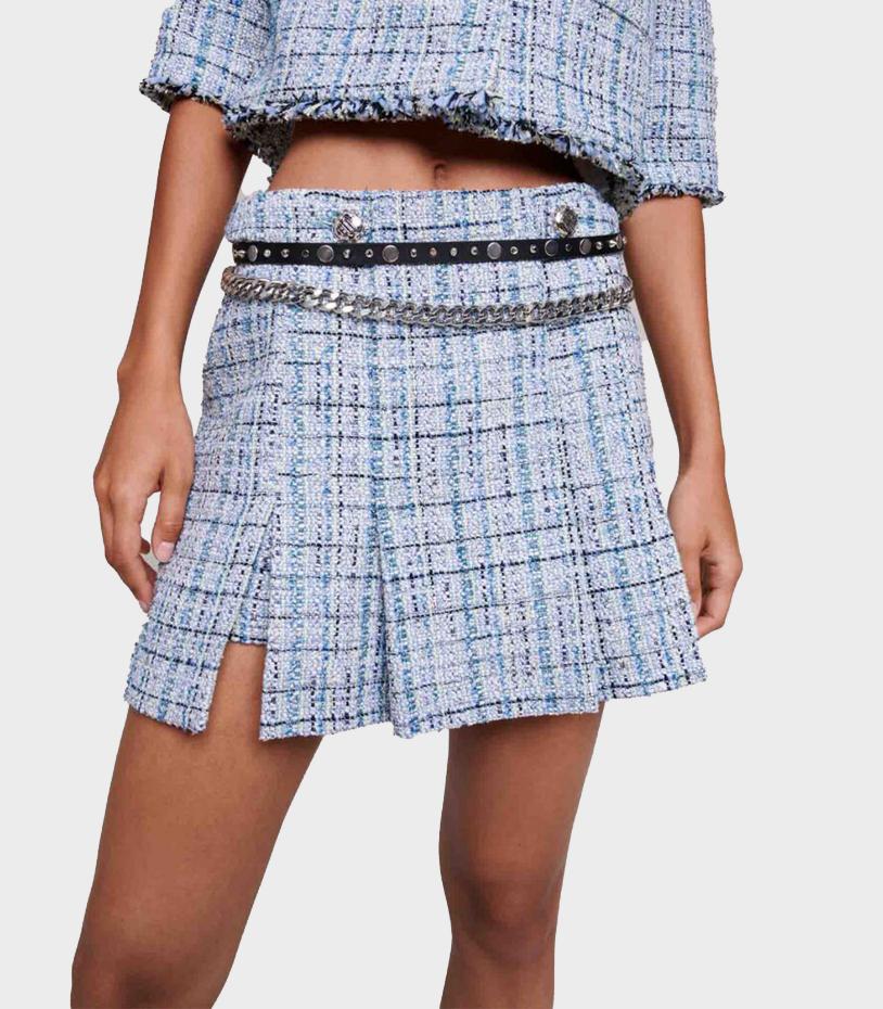 • This season, the studio is paying tribute to the Maje girl and her iconic carefree style. Passionate about iconic pieces with on-trend twists, like this short, pleated tweed skirt, featuring metallic fibres for a subtle shimmering effect. Slightly flared, this box pleat skirt has a short lining for total comfort and features tab details at the sides with silver metal buttons and a zip fastening.