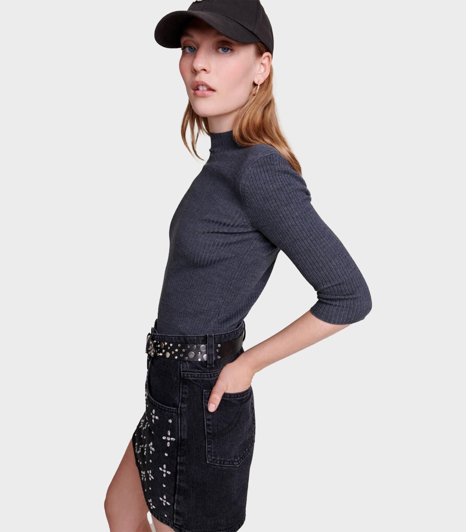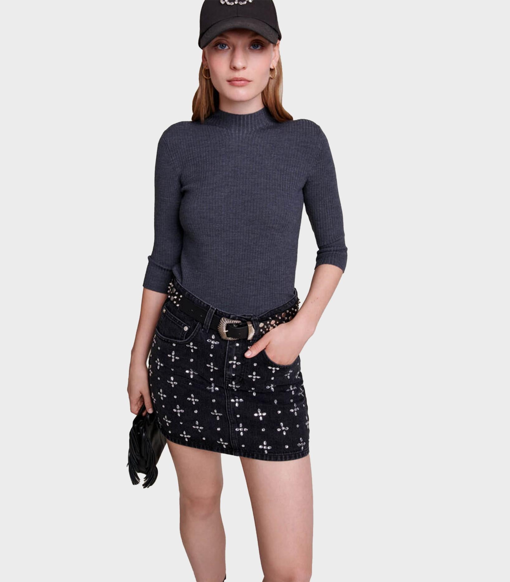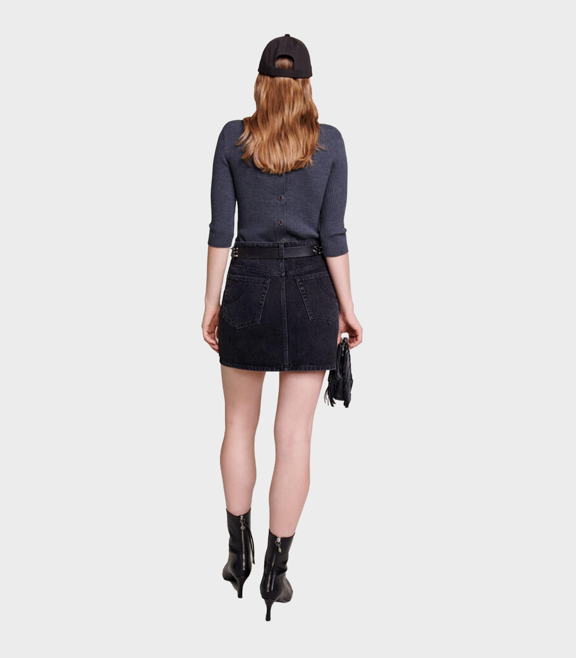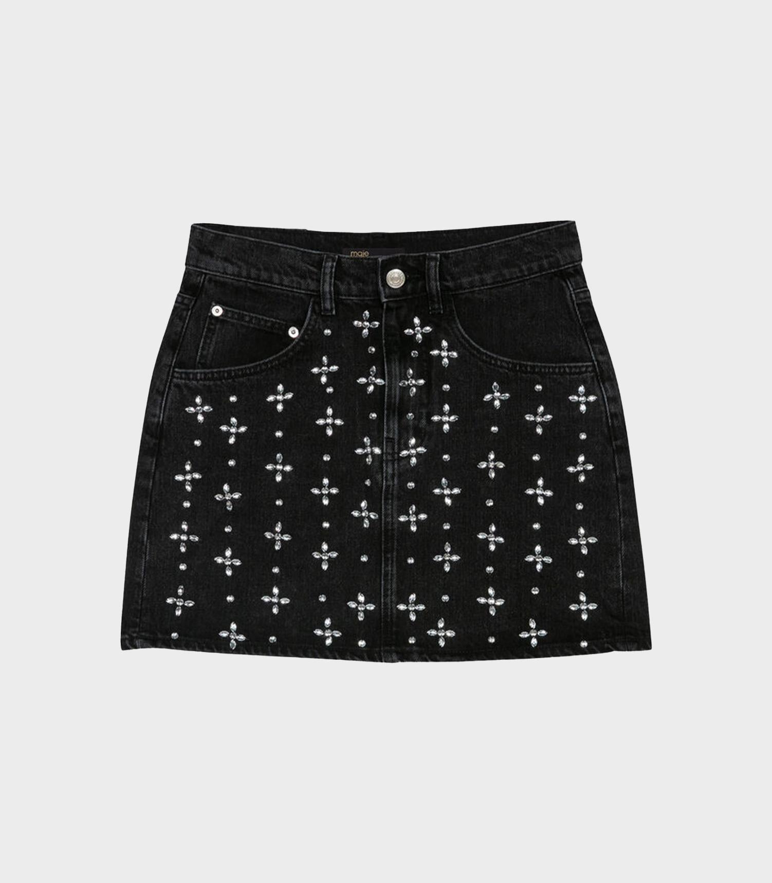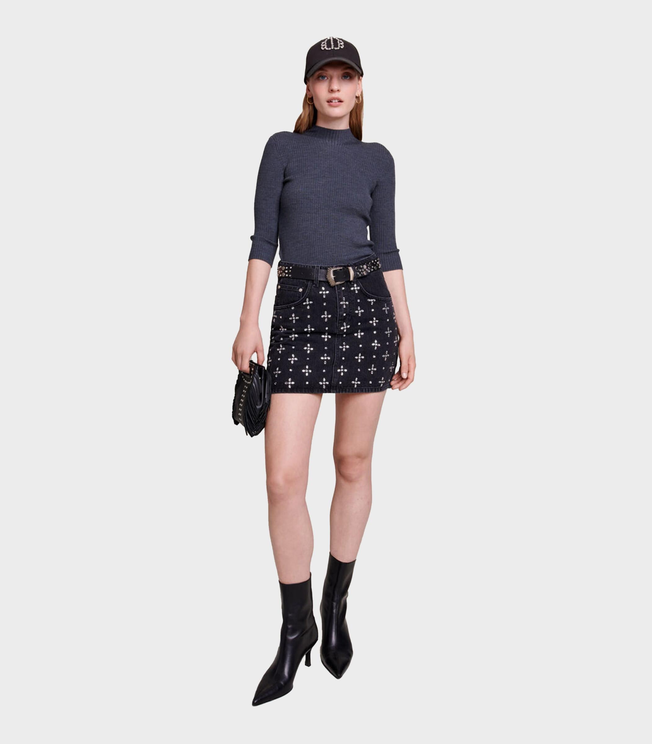 • This season, the classic denim mini-skirt has been reinvented with a touch of rock and romance. Slightly flared, it has a buttoned zip fastening, five pockets and a Clover jacron on the back. Super stylish, it is embellished with silvery rhinestones in a cross shape to really make your stylish look stand out. For a structured silhouette, slip a belt through the belt loops to emphasize the waistline.