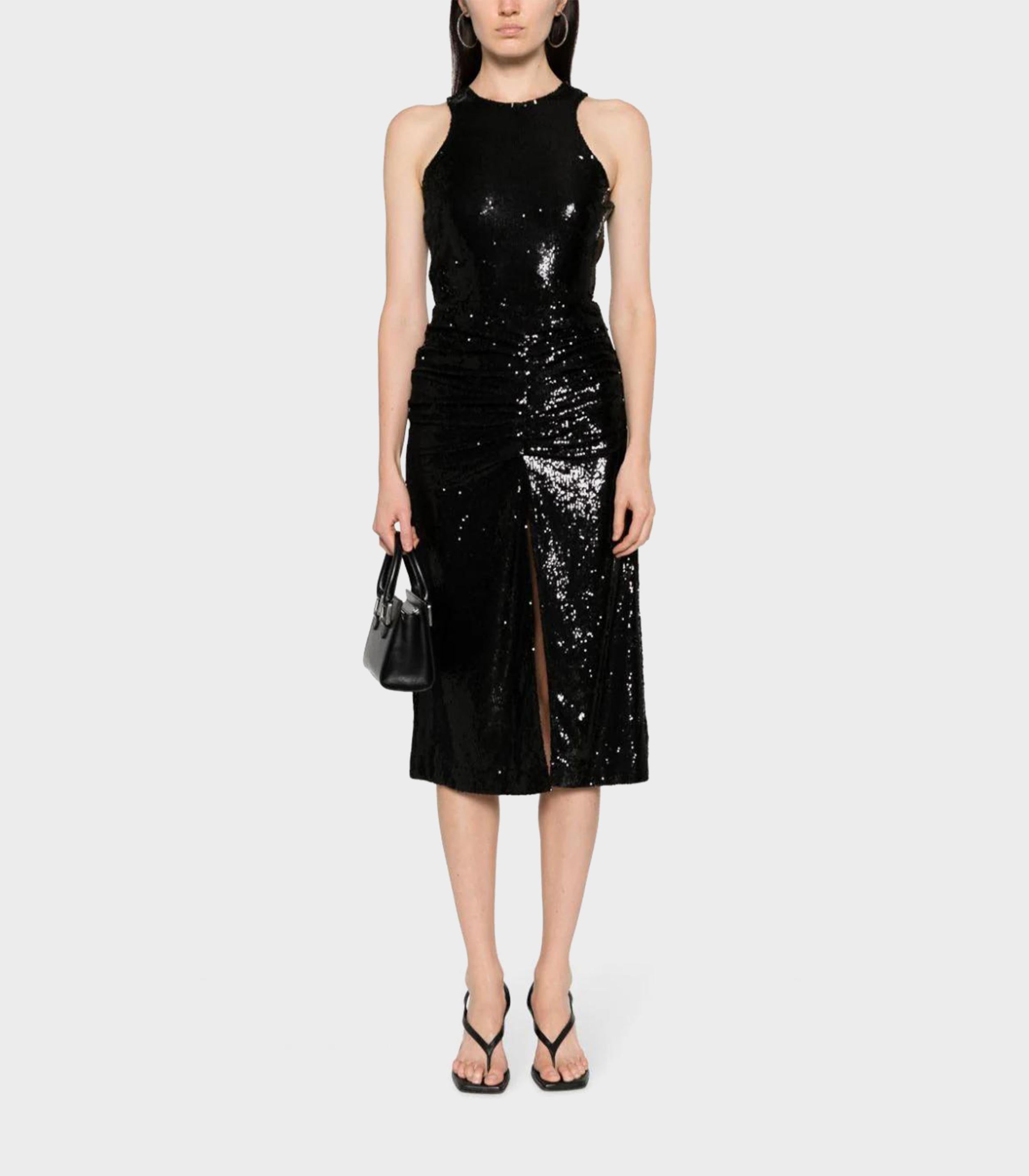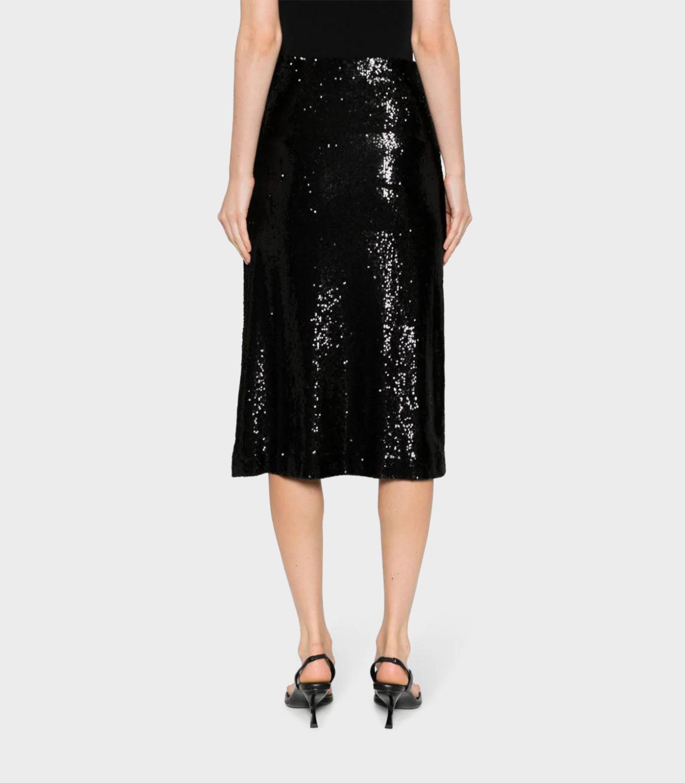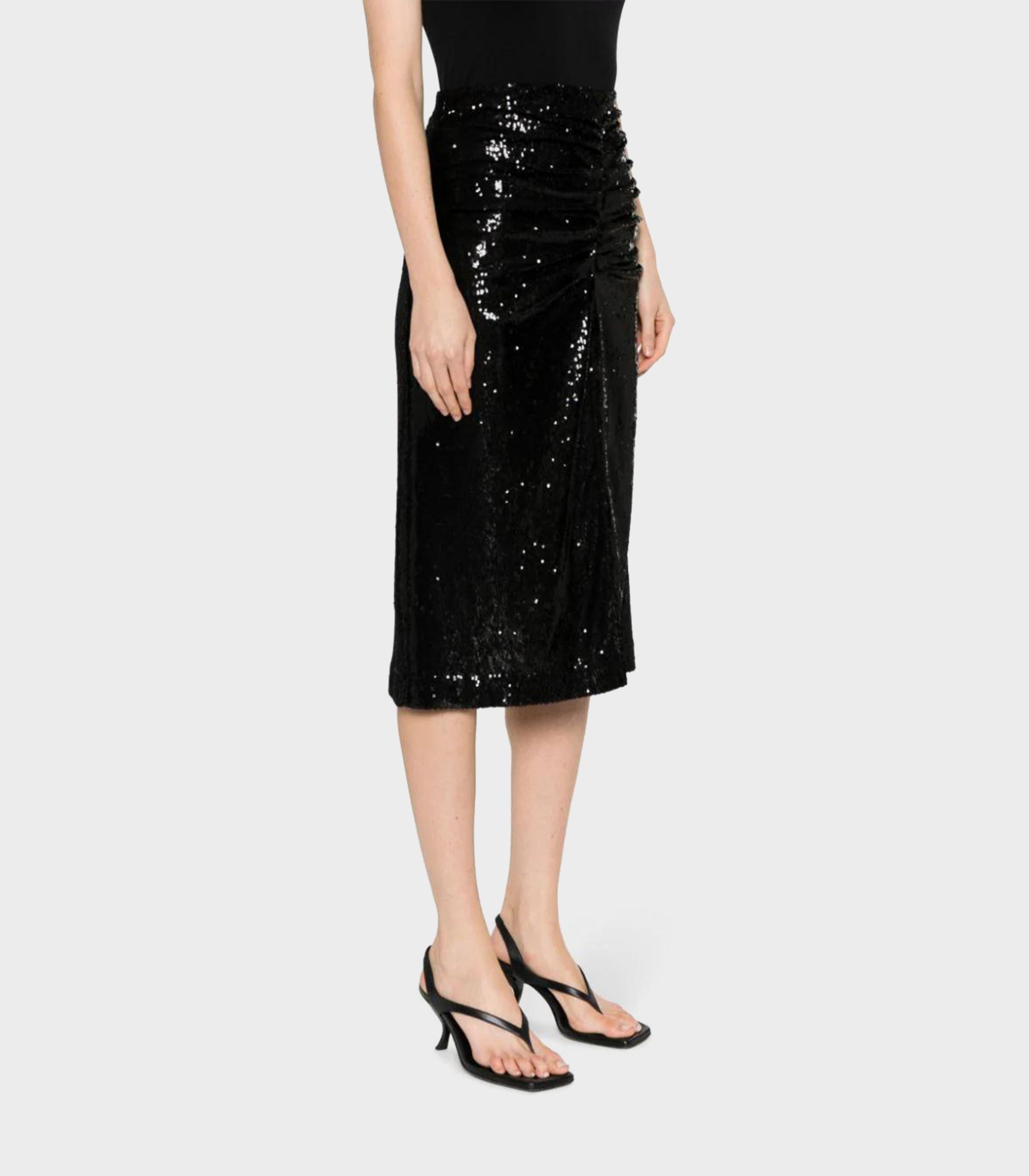 • Featuring a side zip fastening, this midi skirt is bursting with sexy details for an eye-catching party look. Accented with all-over sequins, it is draped with a slit at the front for a subtle glimpse of skin.