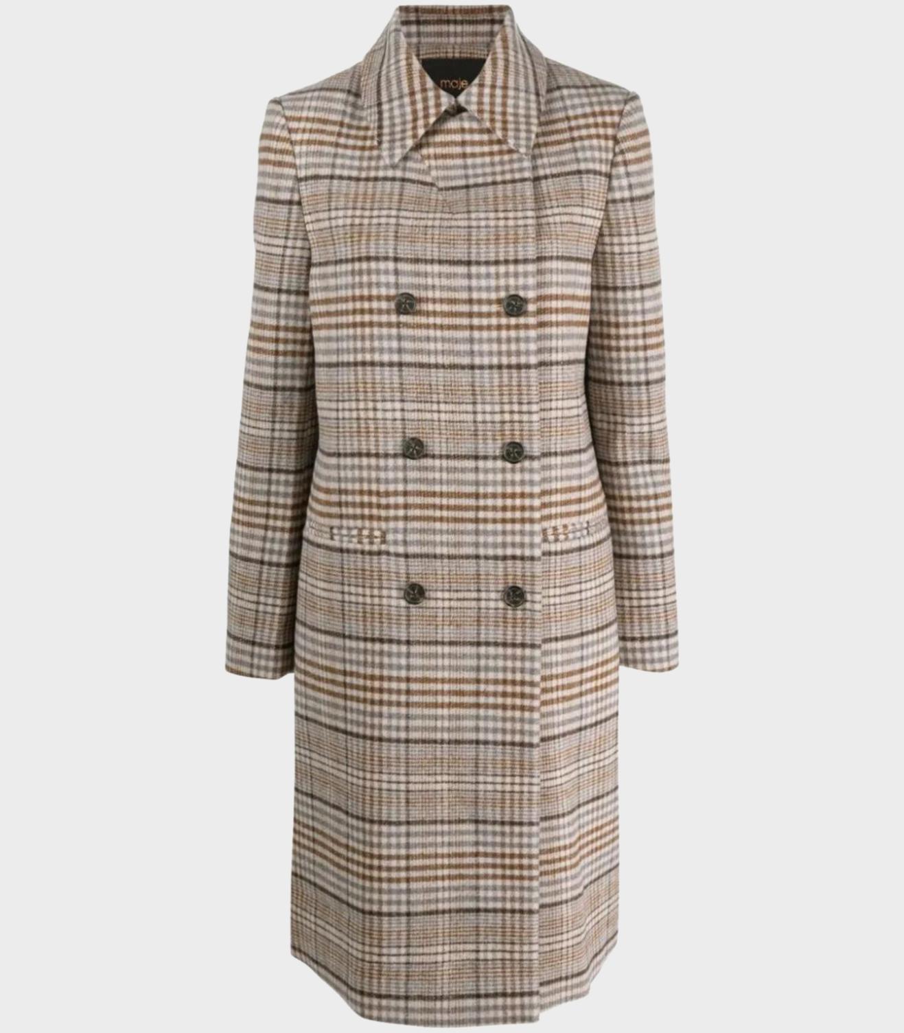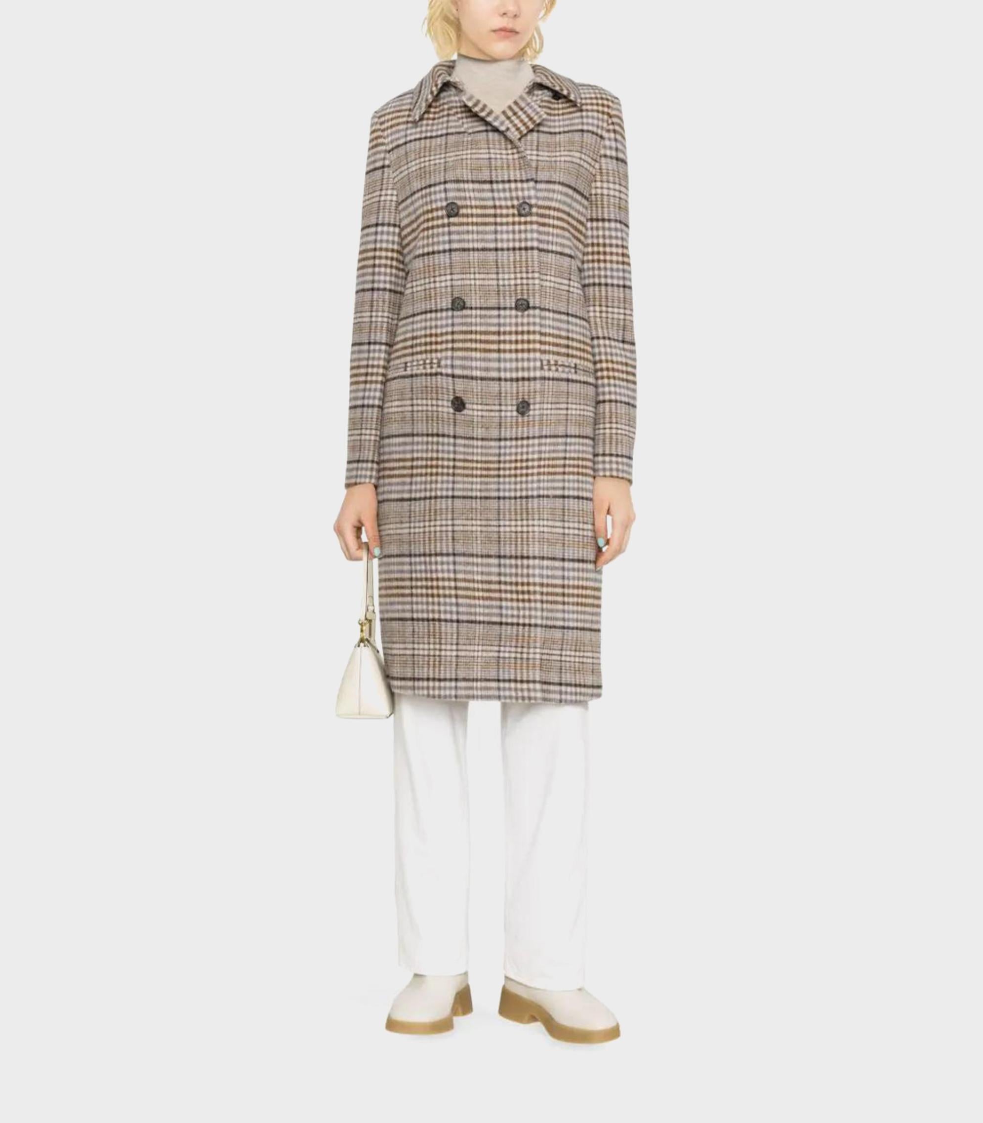 • The traditional Prince of Wales check features on this long, straight coat. It has long sleeves, a turn-up collar and a double-breasted design. For a warm and stylish addition to your look, it has a boyish design and a timeless cut, for a structured, assertive silhouette.
