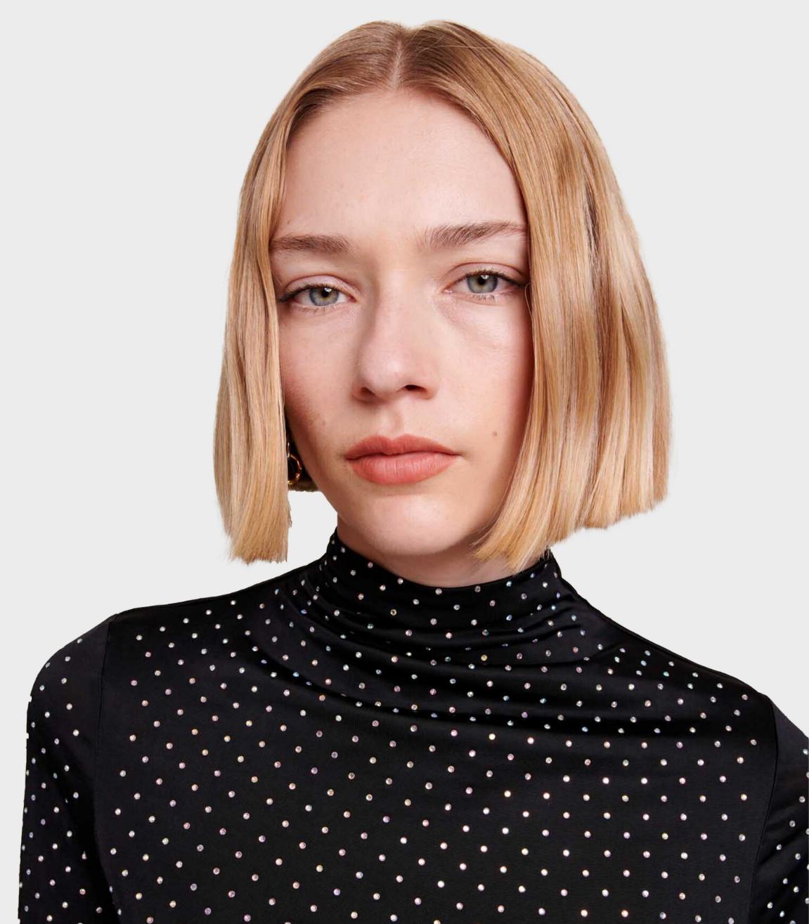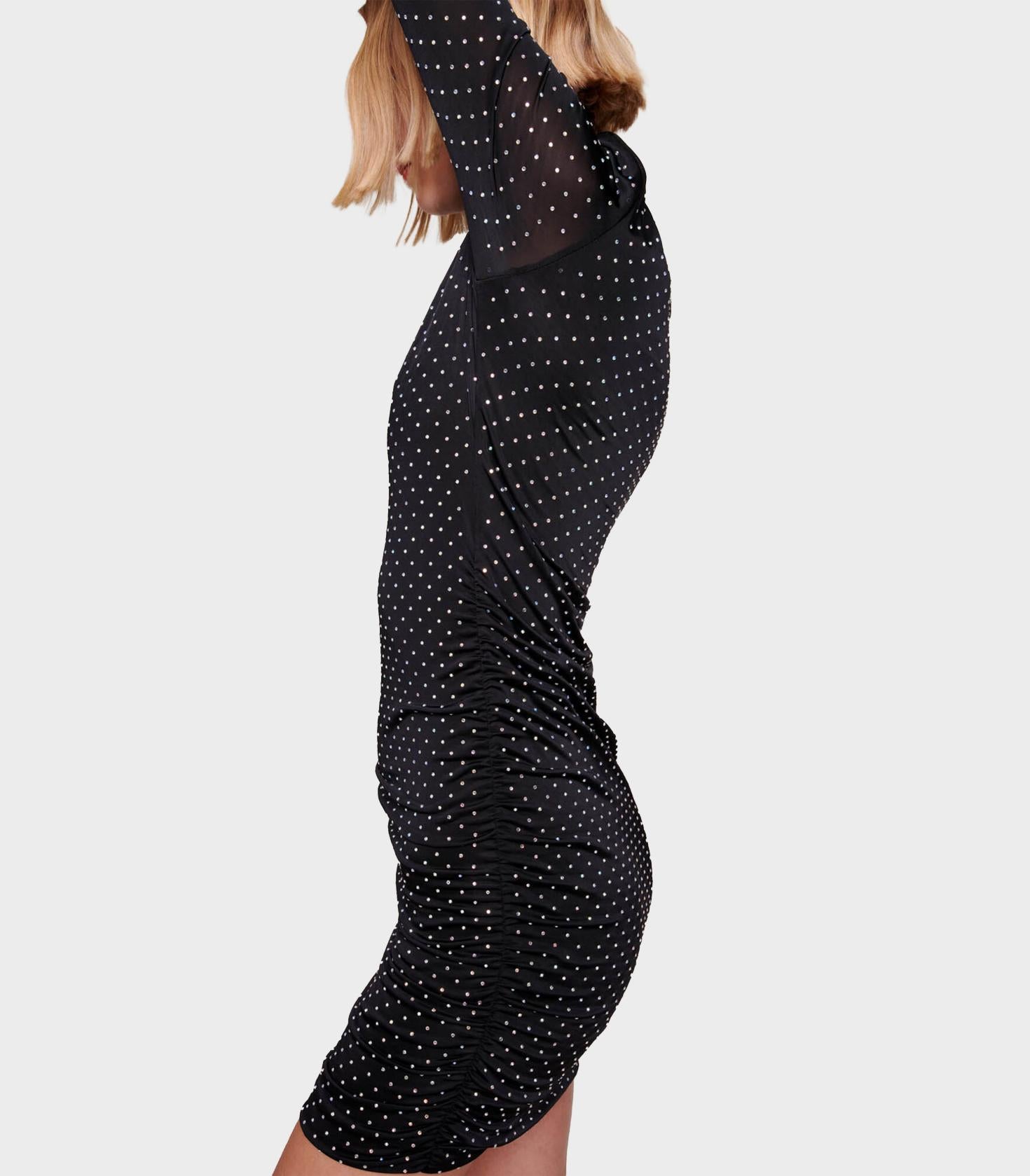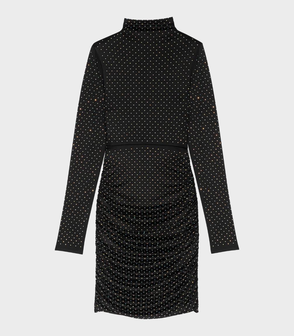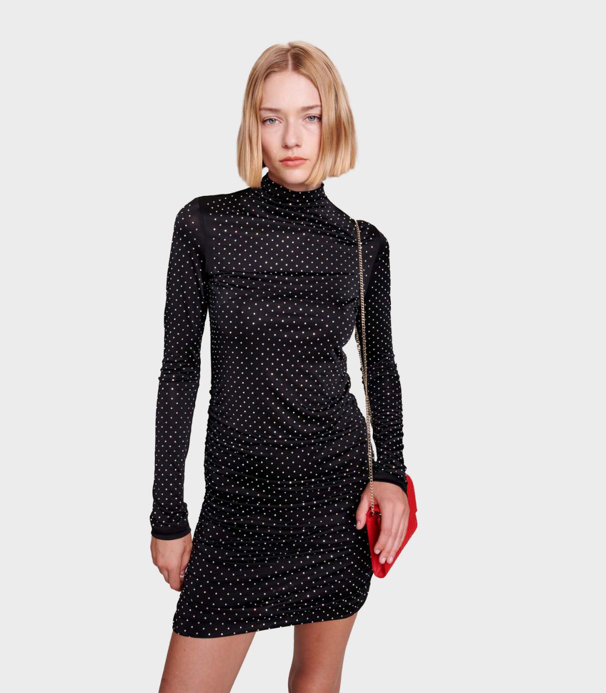 • Featuring a slightly high neck and long sleeves, this close-fitting short dress has sparkling rhinestones all over. Add a chic clutch and pumps to complete your evening outfit.