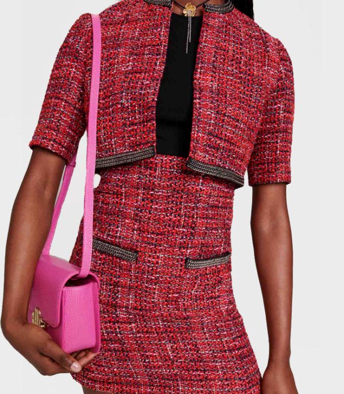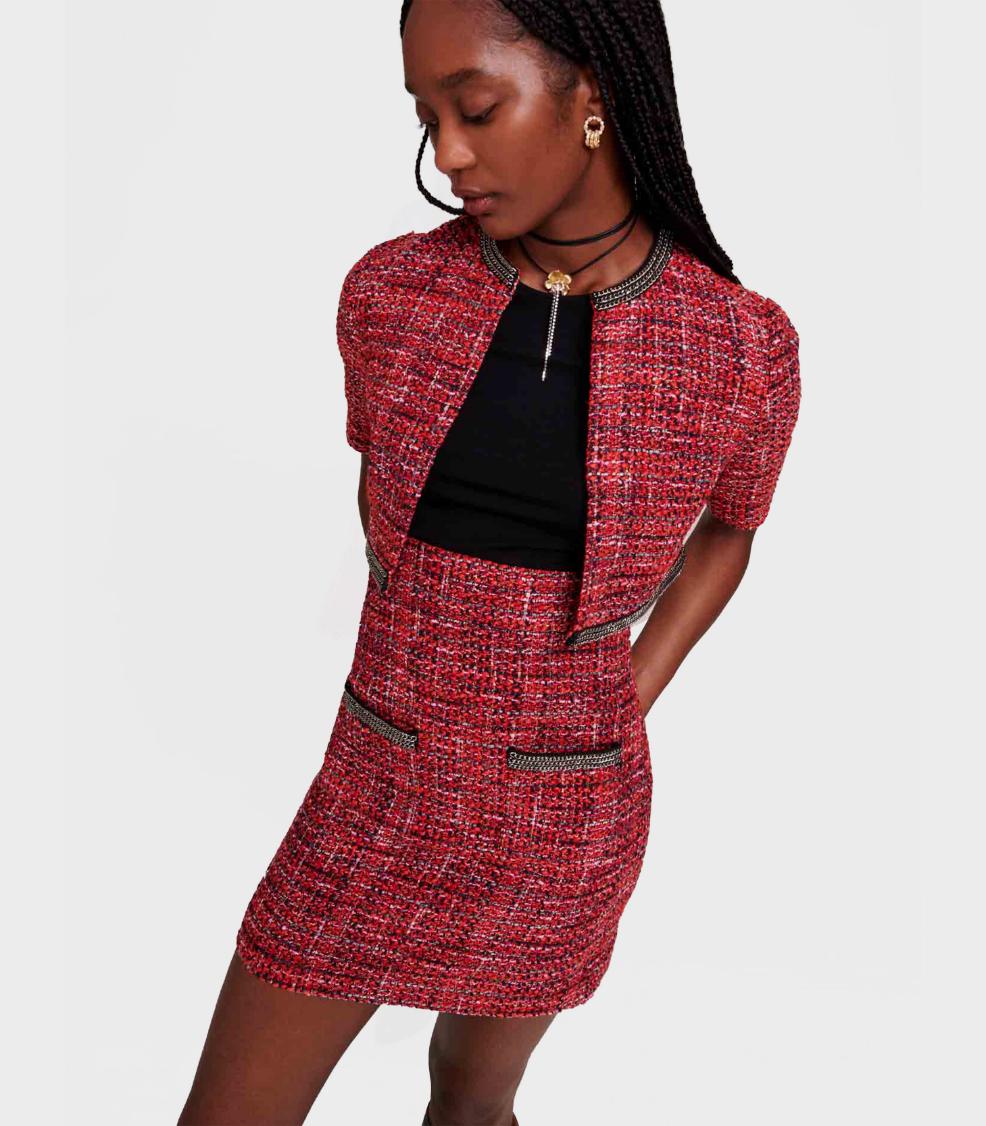 • Featuring a round neck and short sleeves, this 2-in-1 short dress features an interplay of contrasts and a structured silhouette. Made of bright red decorative tweed, it is complemented by a straight skirt with two patch pockets and a zip fastening, and a three-quarter-sleeved jacket with a round collar. What makes it so chic? Its chain detailing, which adds a rock'n'roll touch to the look.