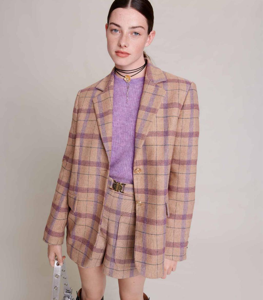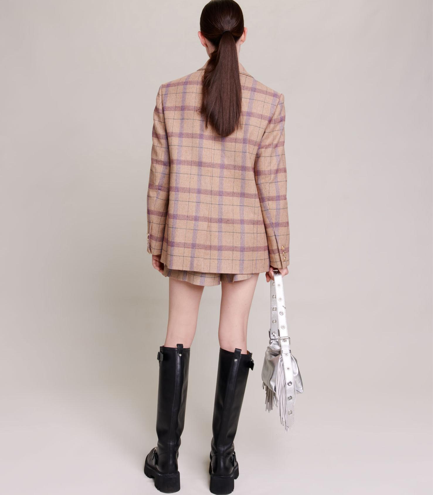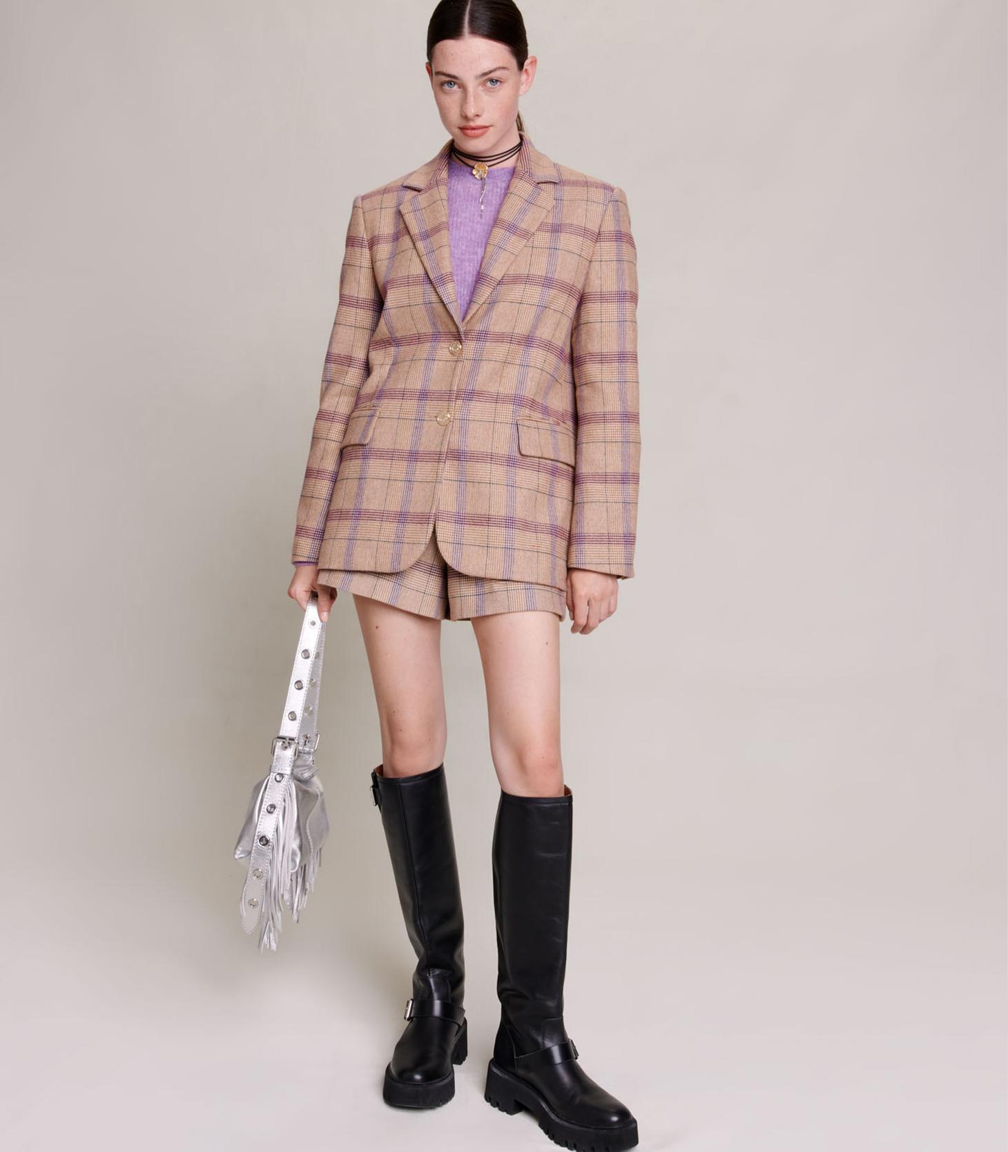 • With this latest collection, the Maje girl adopts a bourgeois Britain look, mixing classic sexy and retro items for a bold effect. Crafted in brushed wool, this straight-fit suit jacket displays a Prince of Wales check print with subtle tinges of violet. Featuring a suit collar, long sleeves and a back vent, it has a gold metal Clover double-breasted fastening and two flap pockets. Perfect for daytime or office wear, it offers a shapely and alluring silhouette. Easy to pair ad accessorise, wear it over shorts cinched with a belt, a jumper, jewellery, boots and a bag.