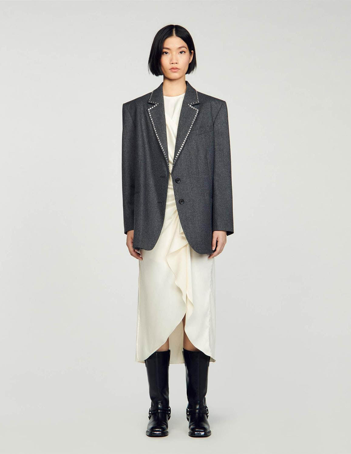 • Wool suit jacket with long sleeves and a collar embellished with rhinestones.